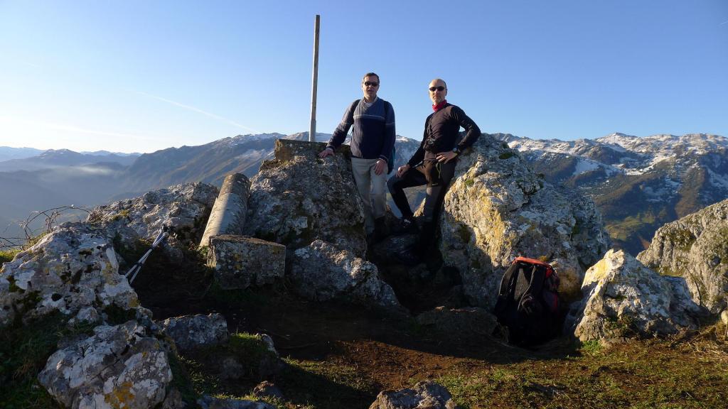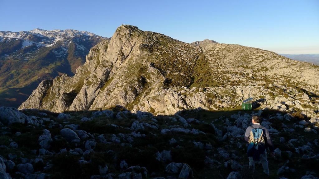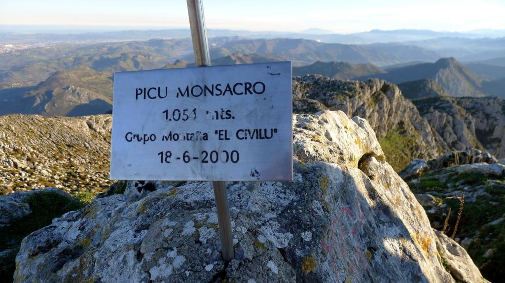 Accedemos a un colladito entre el Marieyu y el Monsacro, en zona dominada ya por el incómodo lapiaz calizo, donde hay una pequeña estación meteorológica (1025m 1h21′). Por aquí nos podemos guiar por señales de pintura con puntos amarillos. En dirección oeste llegamos al que llamo vértice del Monsacro (1055m 1h28′) porque tiene un mojón de vértice geodésico, aunque también está la placa que pone pico Monsacro. Descendemos unos metros y nos dirigimos al siguiente pico (SW), ascendiendo más cómodos por una vaguadita. Este debería ser el auténtico pico Monsacro (1057m 1h50′), dos o tres metros más alto que el de la placa.