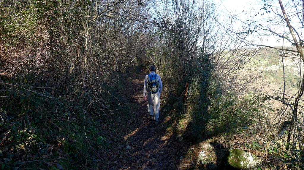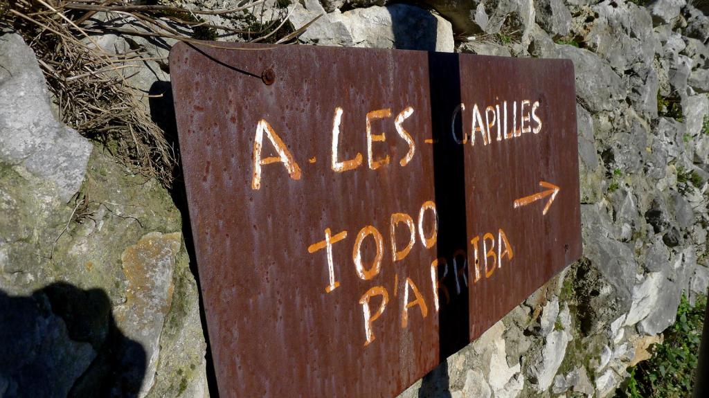 Desandamos el camino hasta el punto justo encima de la ermita de arriba para tomar una ladera de arbustos pinchudos y lapiaz incomodísima a nuestra derecha (E) con el fin de llegar sin perder altura al collado entre el Marieyu y el pico del Mayau de les Capilles (905m 2h35′). Aquí tomamos una pista que da una gran vuelta y llega a otro collado junto al pico Canto la Sierra con una antena de TV (833m 2h51′). La pista desciende hacia el S dando curvas, de nuevo junto al tendido eléctrico y tiene marcada con pintura el recorrido de un vía crucis. Hay que destacar el precioso tejo que crece incrustado en una grieta de la roca. Bastante gente sube por este camino.