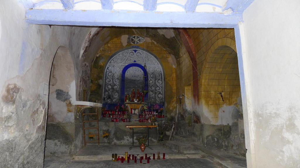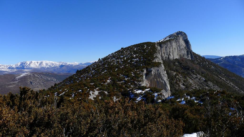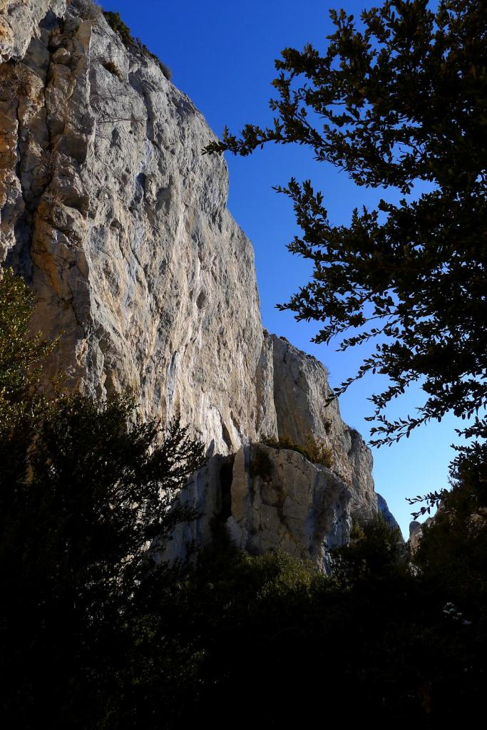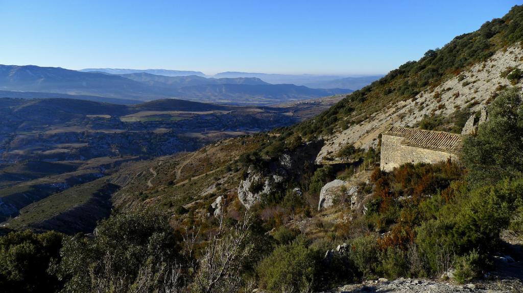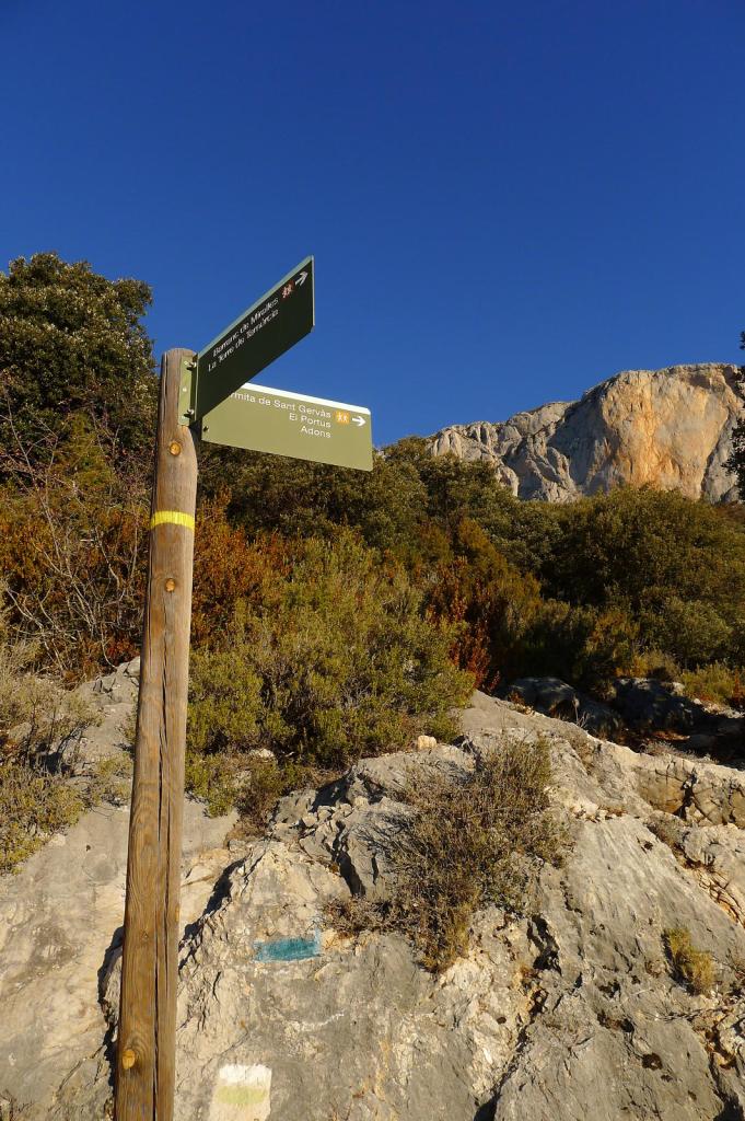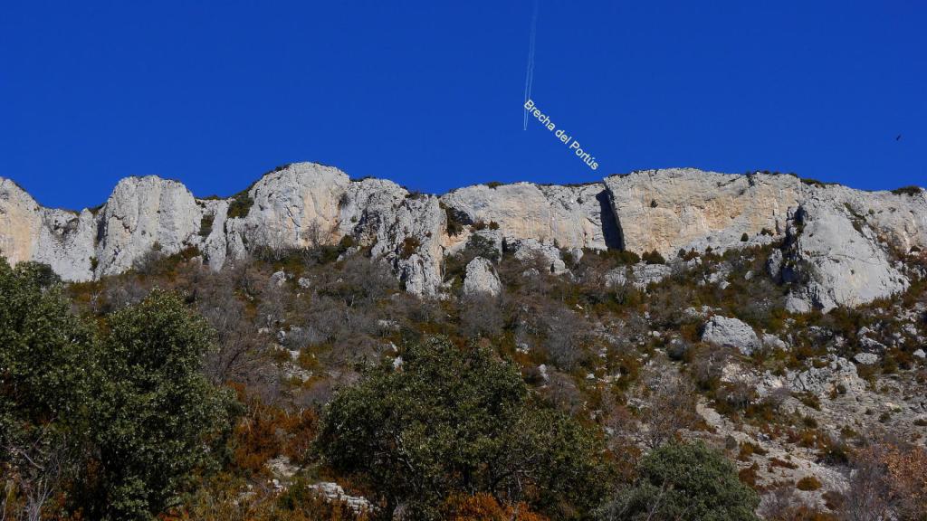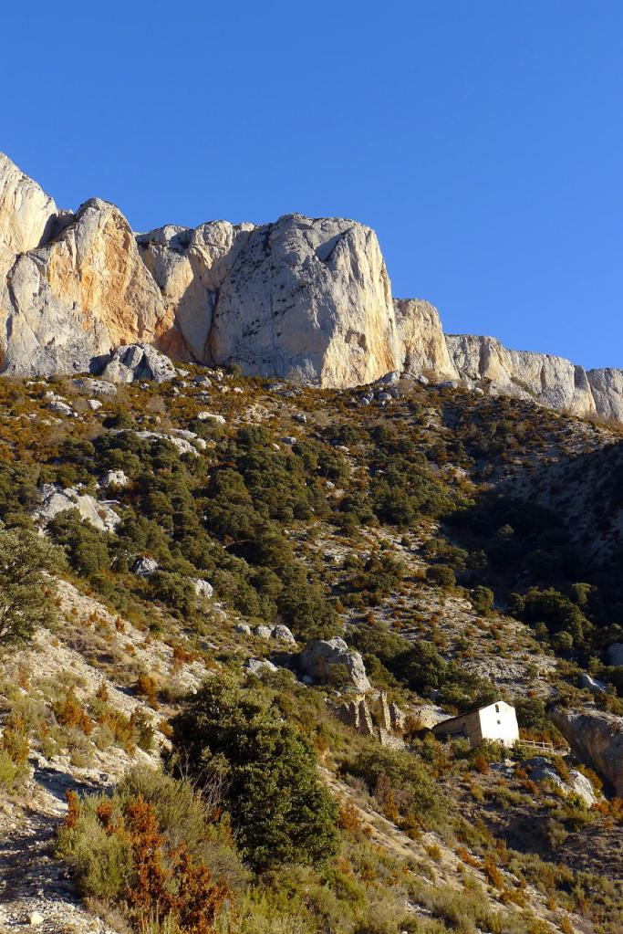 Llego a la ermita de Sant Gervàs (1273m 0h43′), con una capilla y restos ruinosos que recuerdan épocas de mayor apogeo, y sigo subiendo por su derecha. La senda hace una media ladera hacia el E para llegar a un hombro (1385m 1h04′) donde se toma decididamente dirección N y fuerte pendiente. Por fin alcanzo la base de la imponente pared (1640m 1h32′) con chapas para las vías de escalada.