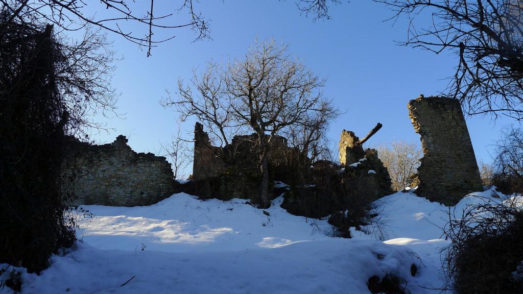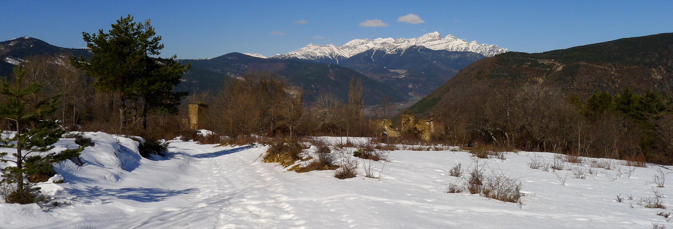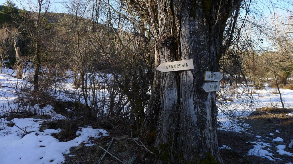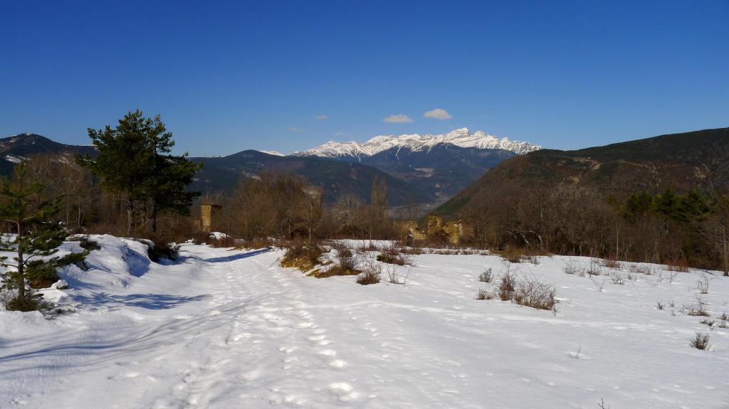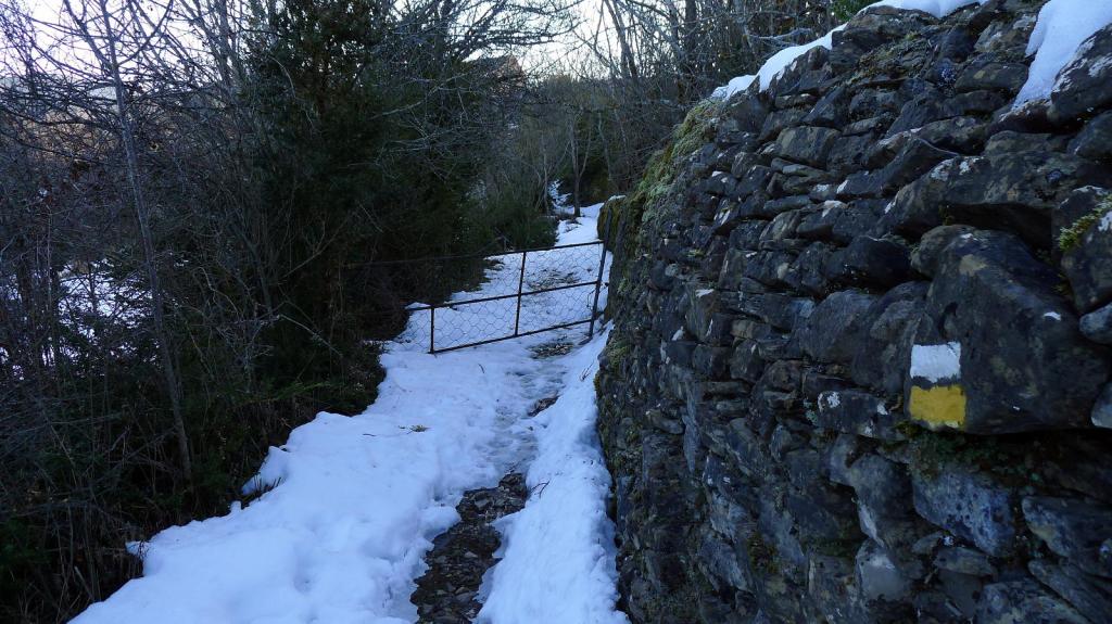 La senda asciende entre muretes de piedra (S) hasta Casbas de Jaca (1180m 1h08′), pueblo abandonado. Salgo a la pista (ESE). Después de una curva en herradura a la derecha dejo la pista por una traza a la derecha (E) (1325m 1h40′); no sé cómo será la senda porque está cubierta de nieve.