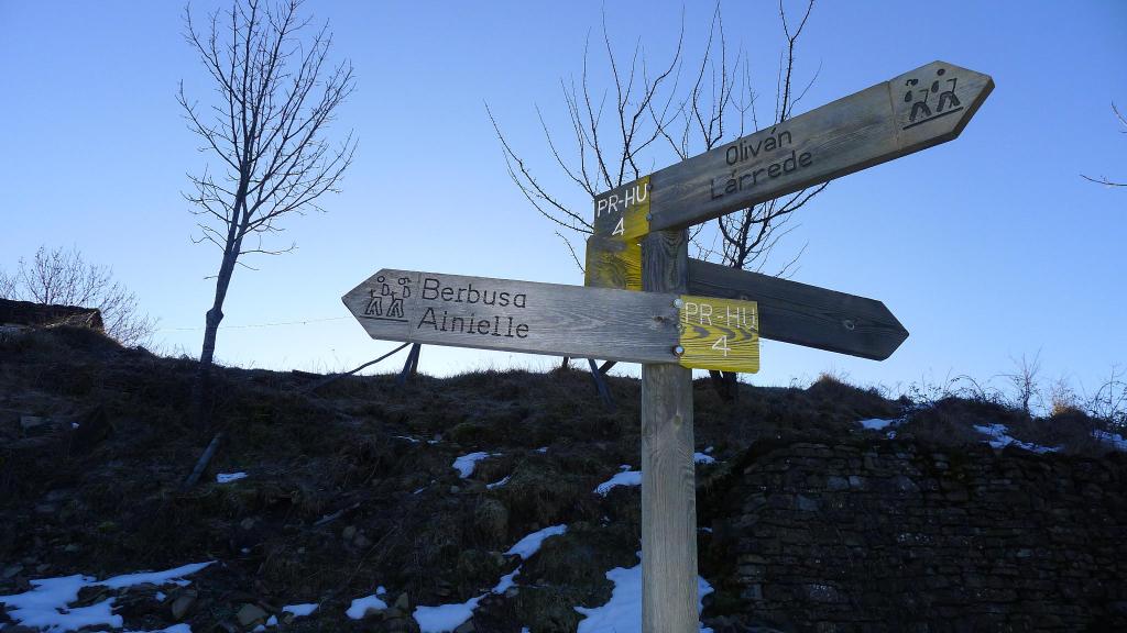 Mañana fría y soleada, sigo una ruta del blog de David Naval, pero no llego hasta la cima de Oturia porque empieza a haber nieve muy profunda y el avance se vuelve muy trabajoso. Las marcas del PR.HU.4 se siguen fácilmente hasta Casbas, la salida de Casbas es algo confusa y luego escasean las señales amarillas y blancas. Yo voy fijándome en las huellas de esquís, probablemente de David y su grupo.