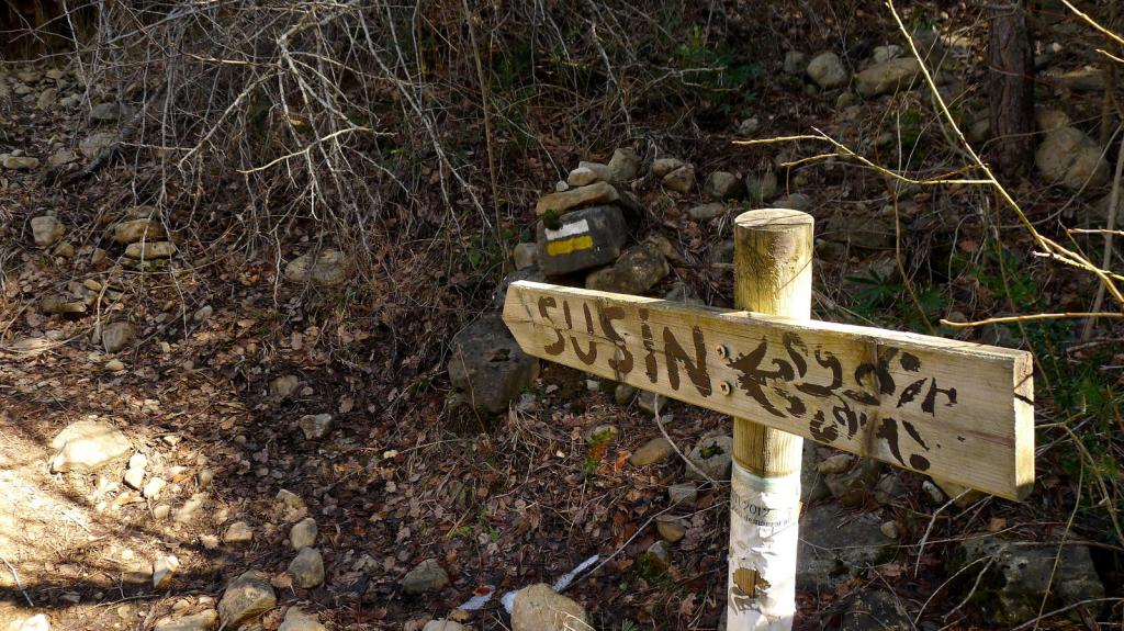 Aparco junto a la iglesia de San Martín de Oliván (895m), precioso ejemplar del románico de la comarca. Se desciende por una rampa de cemento hasta el barranco de Oliván, que se cruza un poco más adelante por un puente (885m). La pista encara dirección S y en una curva a la izquierda se toma la senda (920m 0h18′) que asciende por bosque de robles y pinos. Se llega al pueblo semiabandonado de Susín (1072m 0h43′).