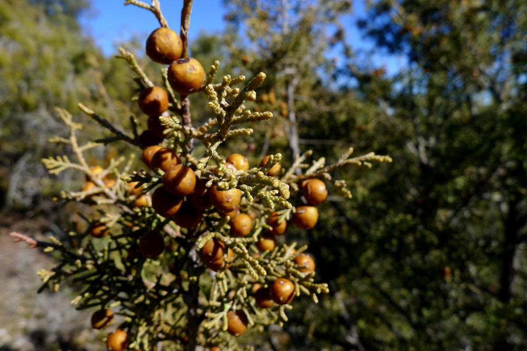 Se baja al punto donde habíamos encontrado la pista y se sigue a la izquierda por senda (E y NNE) con carteles explicando la flora y la fauna. La vegetación vuelve a ser de pinar, pero también destacan sabinas y enebros. Se desciende por la orilla izquierda del barranco de la Trinidad, que desemboca en el barranco del Río (se cruza a los 635m 4h12′) y, por una pista en su orilla izquierda, se llega a la carretera (se cruza a los 613m 4h26′).