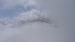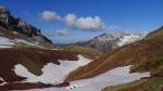 Una fuerte pendiente de hierba me lleva a las rojas pedrizas bajo un resalte rocoso. Para acceder a dicho resalte tengo que lidiar con algunos neveros que me obligan a pensar en las mejores opciones para llegar a la zona de roca más accesible. Con un pequeña trepada alcanzo la cresta muy cerca de la cima (Pico Netera 2289m 3h15′) que ni siquiera tiene un hito que marque el punto más alto. La niebla cierra toda la vertiente E impidiendo ver la zona del Bisaurín.