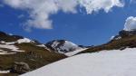 Continúo hacia el E por la orilla derecha del barranco Borreguil de Acher. Hay varias sendas y voy utilizando la ruta más conveniente para esquivar los neveros que, en forma de corredores, desembocan en el barranco principal desde barrancos secundarios. A mi izquierda se levantan las murallas del Castillo de Acher, a mi derecha las paredes de Costatiza, al fondo empiezo a ver el pico Netera y Secús. Los amplios neveros del fondo del barranco los voy esquivando subiendo a media ladera hacia mi izquierda.