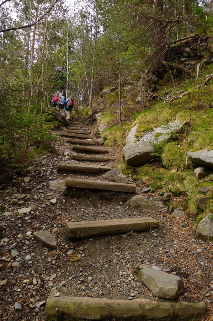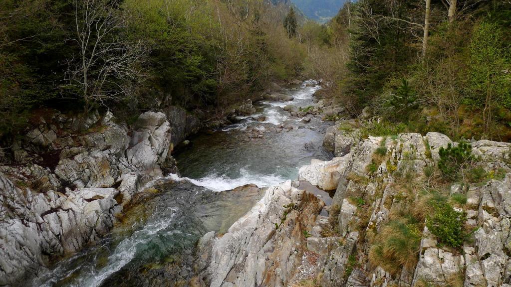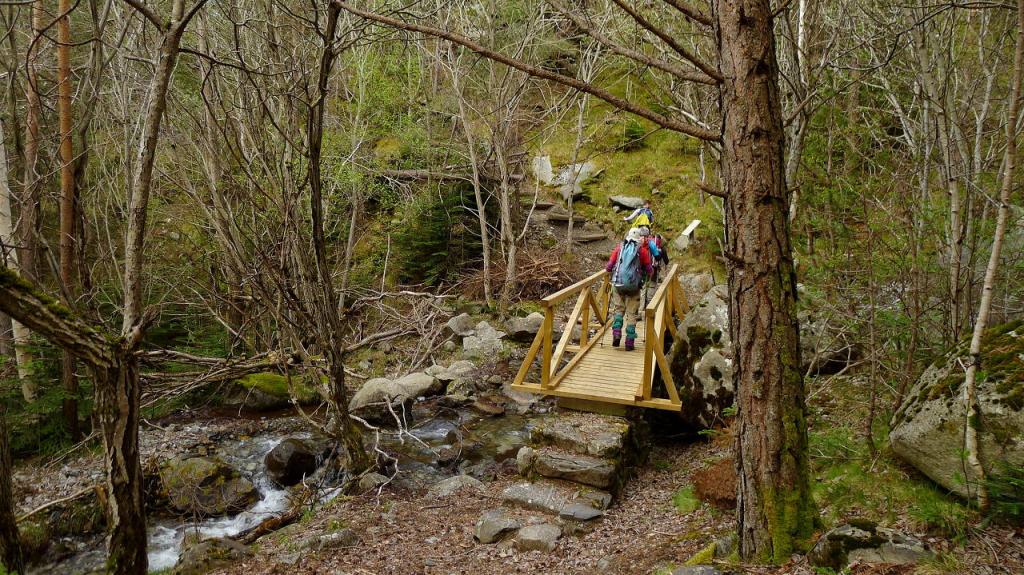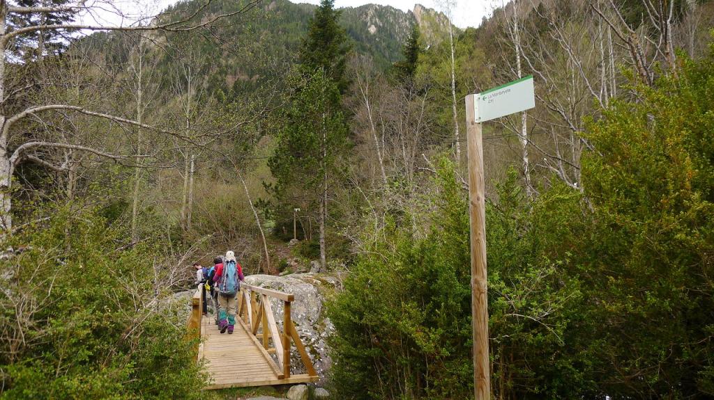 Aparcamos en la planta embotelladora (1415m 0h00′), aunque hay un pequeño espacio justo al inicio del recorrido, 200m más al S. Allí hay un puente que cruza el Noguera de Tor a su orilla derecha. Un camino bien balizado por el bosque de abetos nos lleva a cruzar por otro puente el barranco de la Montanyeta y asciende rápidamente por su orilla derecha en dirección W.