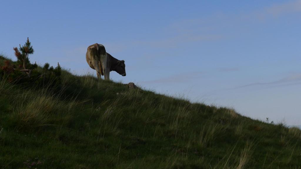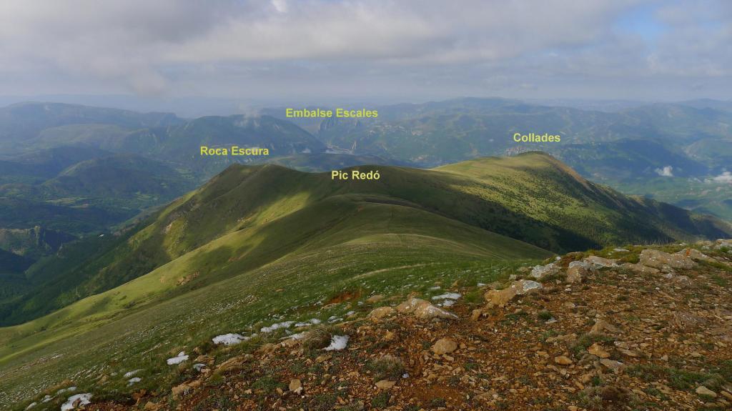 Llego al Planell des Bous (1750m 1h00′), prados ya abiertos y con vacas, y giro a la derecha, dejando el GR, para subir por el lomo de la Calbera de Irgo o Villirulo (1890m 1h24′), sin senda. Sigo por una clara senda por la ladera S de les Collades hasta el collado oeste del Tuc o pic Redò (1995m 1h40′), que evito por el N para ir a su collado NE (2025m 1h50′).