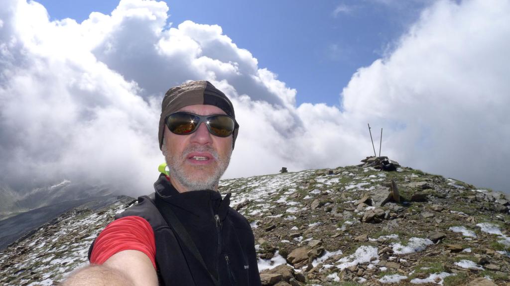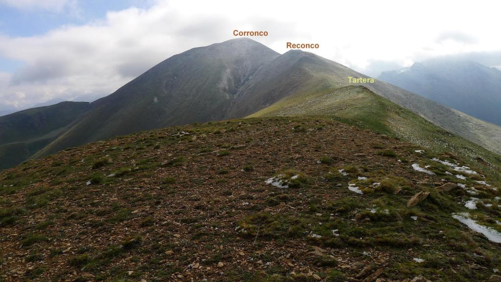 Afronto el último tramo, con más pendiente y un poco más pedregoso, que lleva al Corronco (2543m 2h50′). El tiempo está nublado y amenazante de tormenta, pero luego, durante la bajada, se irá despejando.