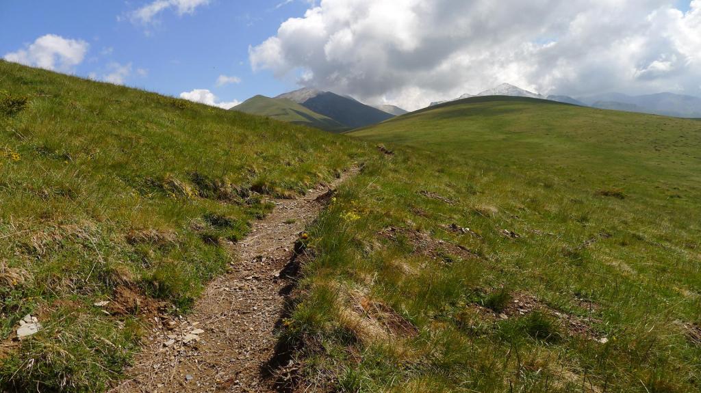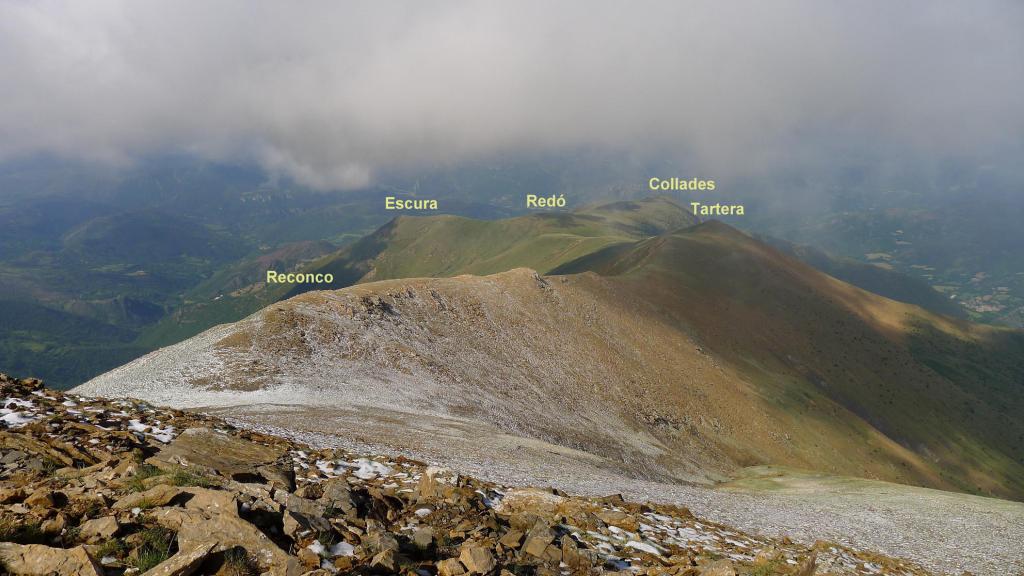 Se toma ya el lomo de la sierra del Riconco (NE), por pasto cubierto del granizo de la tormenta del día anterior, siguiendo unas varillas metálicas preparadas para poner una alambrada. Paso por el pic de la Tartera (2310m 2h17′). Continúo la cresta hasta un punto con un gran hito (Riconco 2459m 2h40′).