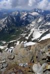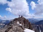 Calzamos ya los crampones y vamos afrontando la pendiente que se va haciendo bastante fuerte, pero por la nieve se sube muy bien. Al llegar a la gravilla inestable ya es más costoso y hay que hacer un esfuerzo importante para alcanzar la cercana cresta SW del Campbieil 3160m 4h02′). Me acerco a una punta SW apenas marcada (3165m 4h04′) y doy media vuelta para llegar a la cima del Campbieil (3173m 4h11′). El valle de la Géla (Neste de Badet) cae vertical bajo nuestros pies, y las vistas del macizo de Monte Perdido y del Vignemale dominan el paisaje.