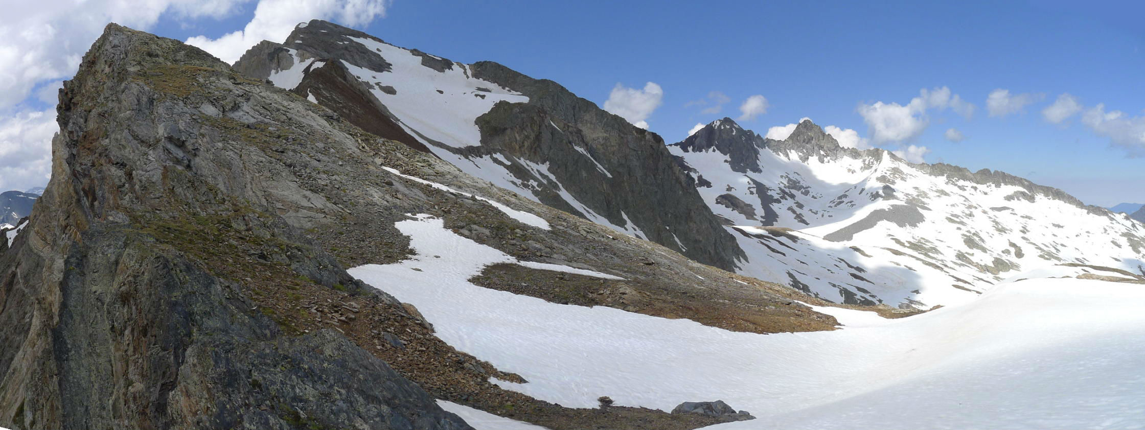 Tenemos que subir hacia un lomo a nuestra derecha sobre el cual hay una zona amplia y llana en la que se han apilado piedras para formar zonas de vivac (2852m 3h04′). Desde aquí nos hacemos una idea clara de la ruta que vamos a seguir hacia el Campbieil, que está justo frente a nosotros. Tomamos una ruta directa por una lengua de nieve que sube hasta bastante cerca de la cresta, un poco a la derecha de la cima, en vez de irnos más a la derecha, hacia la Hourquette de Cap de Long.