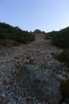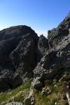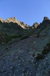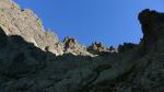 Se llega a un gran prado de gramíneas (1527m 0h35′), luego con brezos y escobas. Se cruza el arroyo (1590m 0h42′). Tras esta zona llego a una pedrera con diversas huellas que zigzaguean para superar la pendiente algo más fuerte. Una bifurcación (2080m 1h30′) que a la derecha va al collado Cabriles, se sigue a la izquierda por una senda que va a pegarse a la roca para introducirse en el Callejo Grande, zona de canales y chimeneas pedregosas y rocosas. Seguir hitos