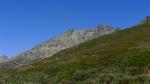 Desciendo hasta el final de la zona rocosa (2085m 3h55′)para ascender a la izquierda (ENE) al collado Cabriles (2154 4h03′) y recorro la cresta ventosa hasta el Hospital (2246m 4h15′). Desciendo por el lomo SE hasta el collado entre Hospital y Huelgas (2160m 4h27′) y desciendo por una zona rocosa por la izquierda (N) para subir por una canal herbosa que se vuelve muy resbaladiza y tengo que retroceder. Sigo descendiendo entonces por la cara S hasta bajar por debajo de las rocas y subir por la ladera herbosa en diagonal al Alto de las Huelgas (2221m 5h12′).