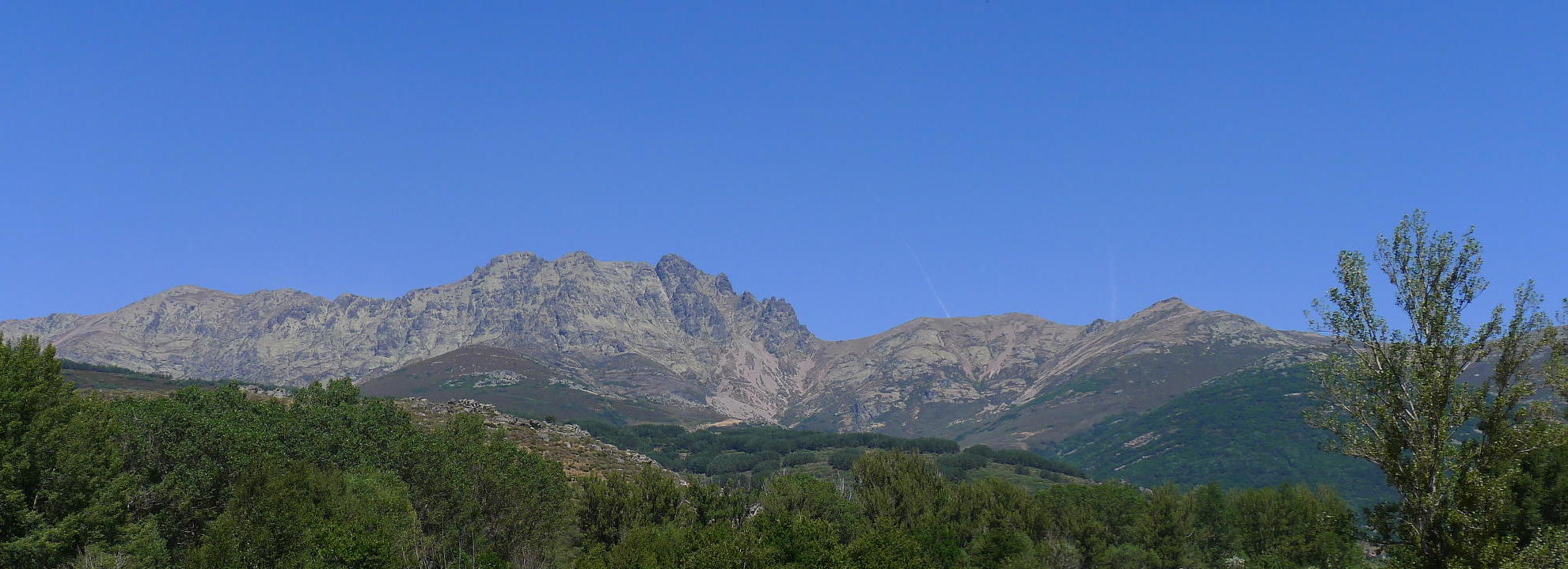 Desciendo por el lomo S metiendome en una zona cerrada de brezo y escoba tremendamente incómoda, buscando las zonas más clareadas, hasta llegar a prados que conectan con un camino (1770m 5h55′). Paso cerca de un refugio. El camino rodea el Coruño por el E y se hace más pedregoso. Atraviesa una portilla (1696m 6h02′) y un pequeño altillo y sigue descendiendo, más cómodo, por la sombra del robledal hasta llegar justo por encima de la iglesia en lo alto del pueblo (1355m) y finalmente al coche (1325m 6h35′)