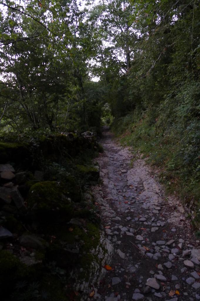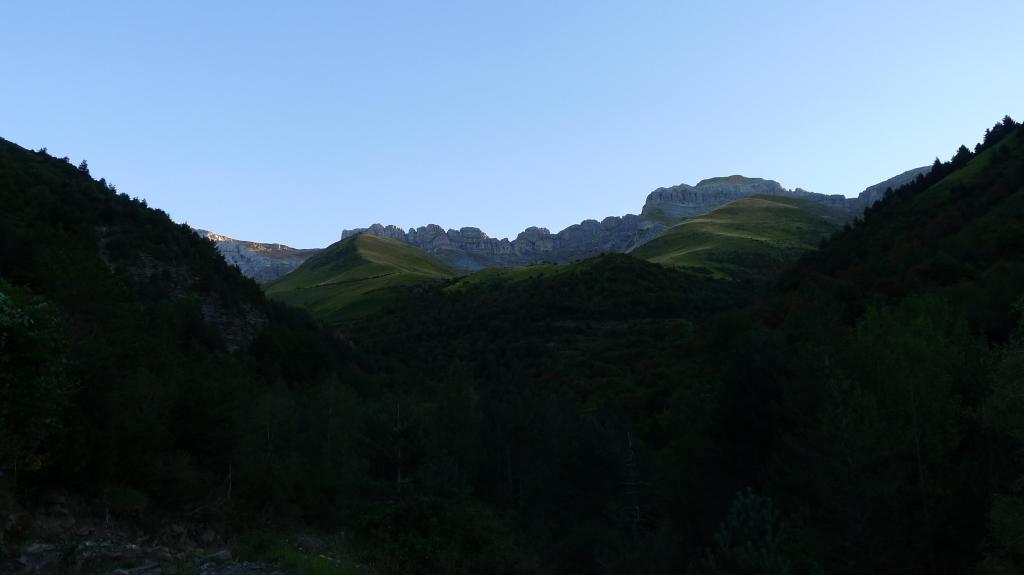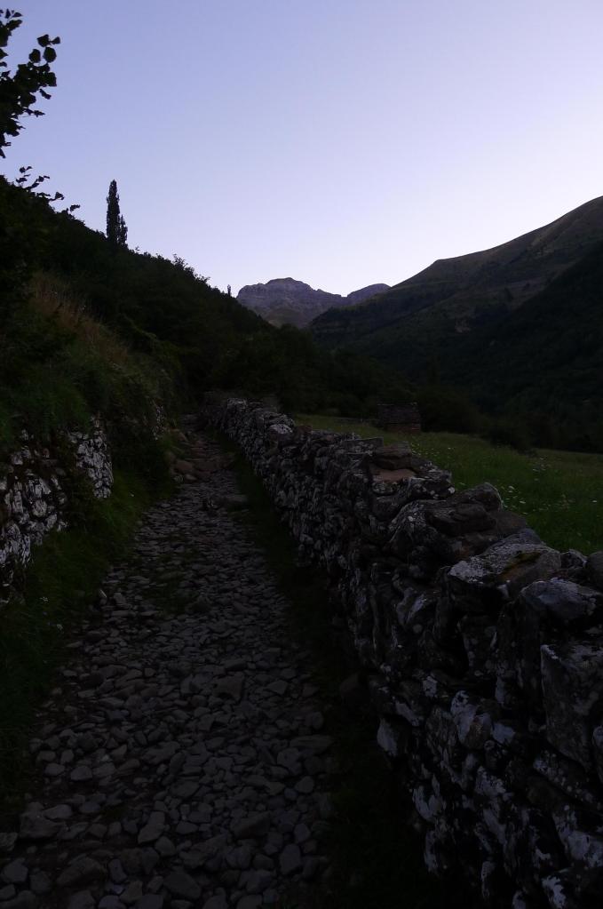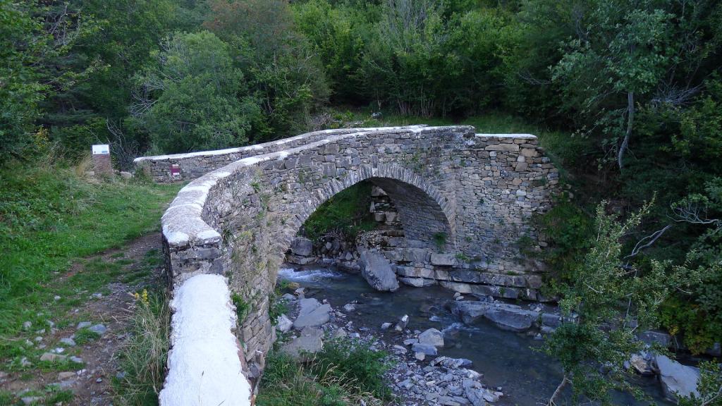 Se sale desde el puente de Sorrosal (1215m) en una curva justo al norte del pueblo de Linás de Broto, con una explanada donde aparcar llena de escombros. Se inicia una pista de la que enseguida nos desviamos a la derecha cruzando el puente de Suaso (1230m 0h04′). La pista se convierte en camino con tramos empedrados, entre bojes y avellanos, ganando muy poca altura. Se traspasa una cuerda para ganado (1385m 0h40′).