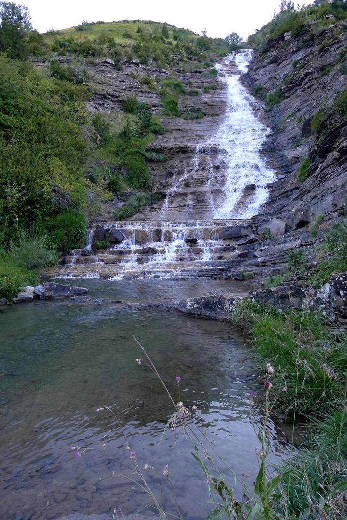 Se pasa a la orilla izquierda del barranco de Sorrosal por el puente A Pasata (1505m 0h57′) y me desvío unos metros a la izquierda para admirar una cascada que desciende del barranco de Abozo. Aquí hay algunos hitos un tanto confusos, tengo que descender un poco para tomar correctamente el camino que inmediatamente desemboca en una pista (1530m 1h17′).