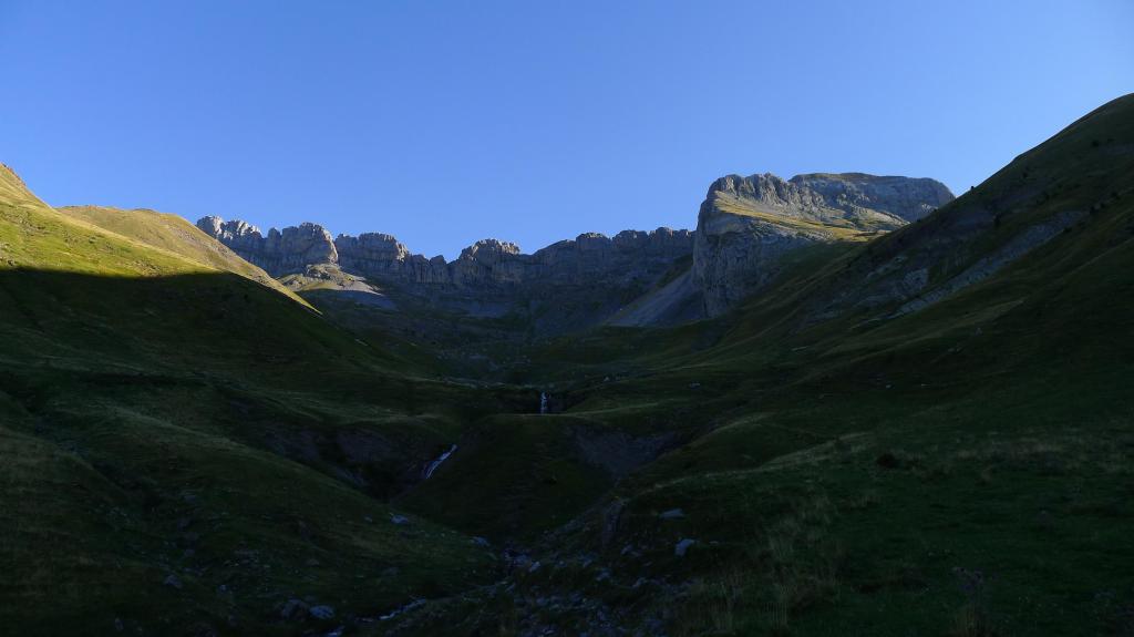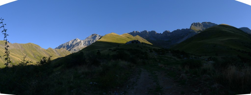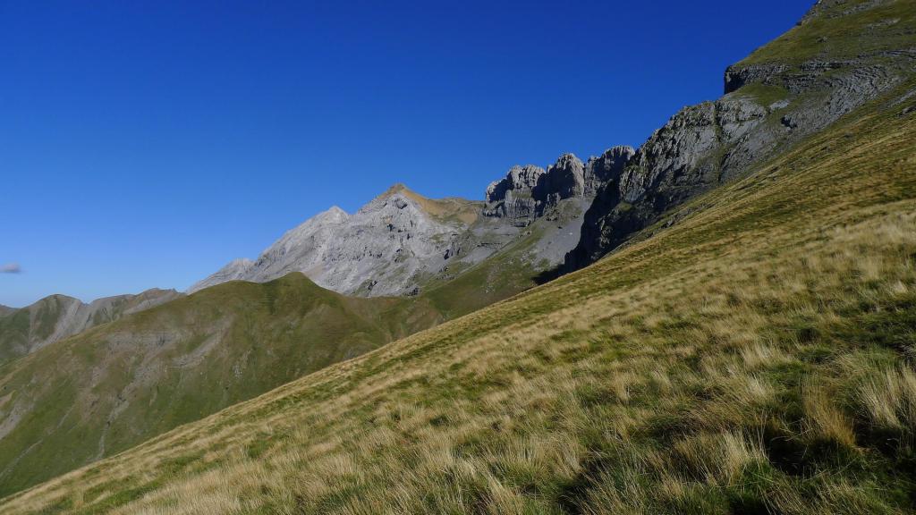 La pista da amplias lazadas, pasa junto al refugio de Abozo (1640m 1h31′) y la abandono en un punto en el que hay una gran roca con un hito encima (1675m 1h36′) un poco antes de unas majadas de ganado. Avanzo entonces hacia el N subiendo por praderas en la orilla izquierda del barranco de Abozo. Hay un poste de medida de innivación (1750m 1h44′). Las laderas de hierba tienen cada vez más pendiente y delante de mí se abre un gran circo. En la parte derecha de dicho circo hay un espolón de roca blanca que es el espolón S de Otal y que debe servir como referencia, ya que hay que subir por la derecha del espolón.