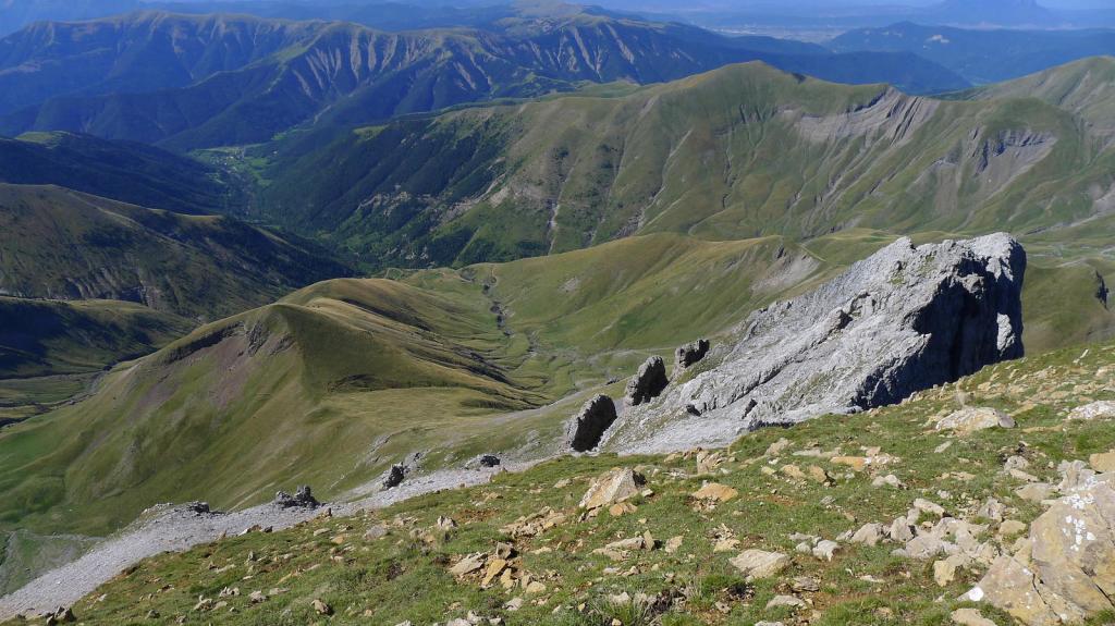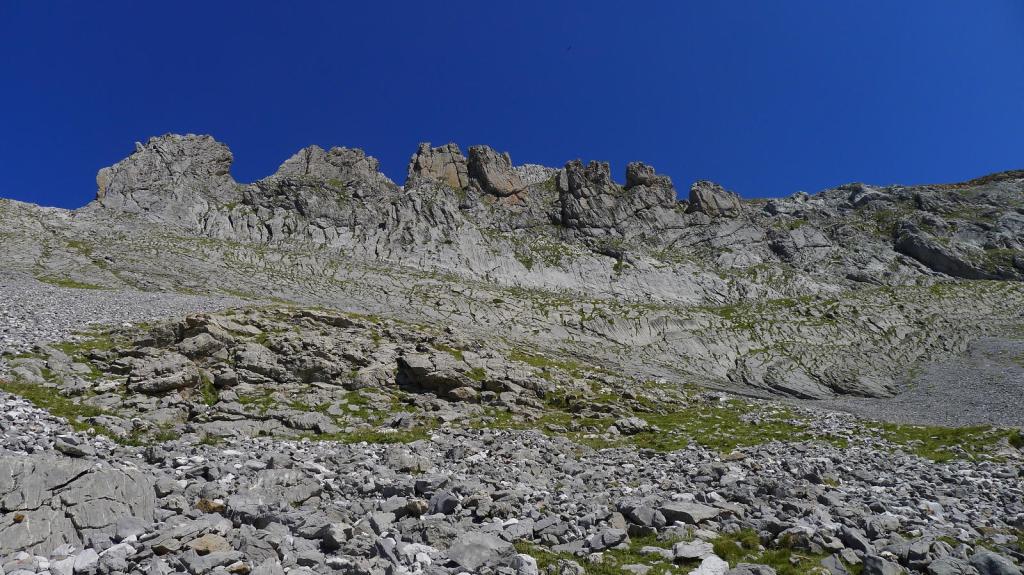 Bajo unos grandes gendarmes y un muro de roca blanca paso por una estrecha faja herbosa (2450m 3h07′) en diagonal hacia la derecha. Pasados los gendarmes se remonta a la izquierda por pasos rocosos algo delicados (I+, II), cruzando varias canales pedregosas. Los hitos marcan pasos clave, pero de un hito a otro no se ve el siguiente. Se llega al fin a una zona más herbosa, justo a la derecha del espolón y con fuerte subida se llega a la brecha entre el espolón y la cresta oeste de la Peña Otal.