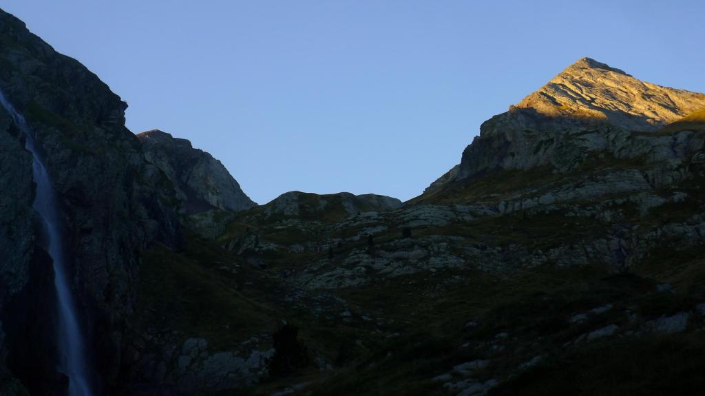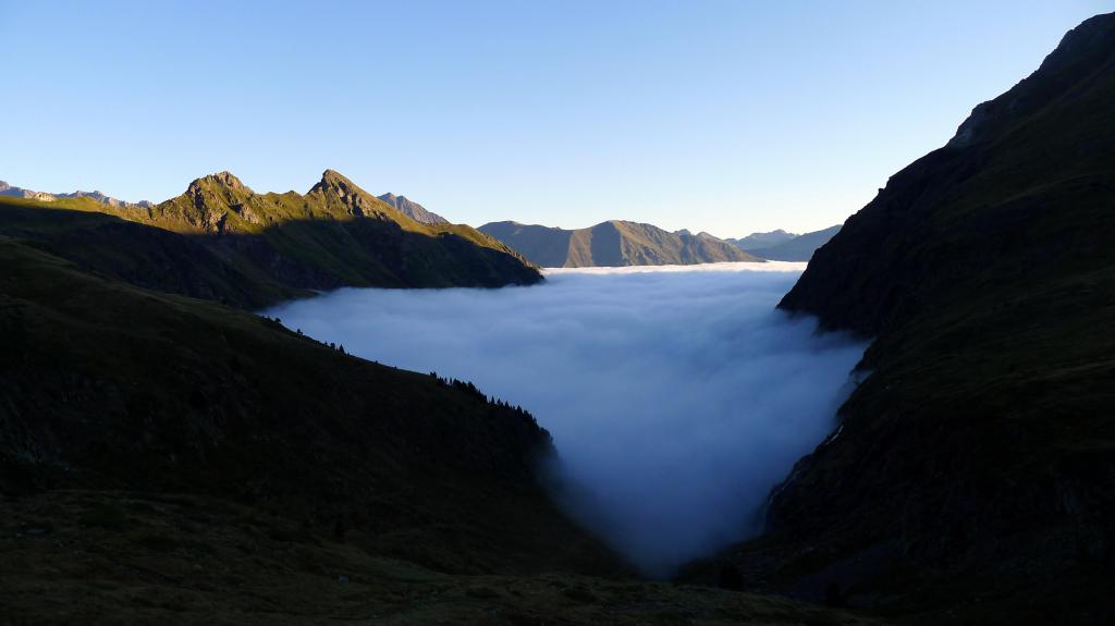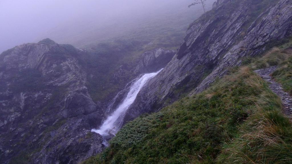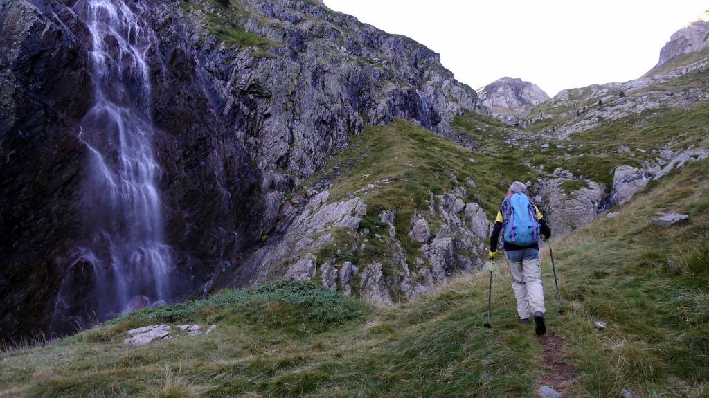 Al cruzar el túnel hacia Francia se encuentra una amplia zona de aparcamiento a la derecha (Boca N del túnel 1820m). Allí se inicia un sendero por la orilla izquierda del río Saux, a nuestra izquierda tenemos una pared rocosa por donde descargan preciosas cascadas procedentes del rio Nère, a cuyo valle tendremos que acceder más adelante. La densa niebla va quedando atrás cubriendo el valle de Saux.