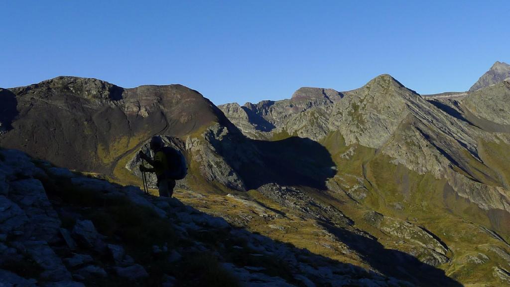 Volvemos sobre nuestros pasos hasta la confluencia de la senda (2320m 1h50′) que conduce al valle superior o circo (además ahora vemos que hay hitos). Sin mayores problemas ascendemos la ladera norte que conduce a la cima del Pène Abeillère (2611m 2h15′).