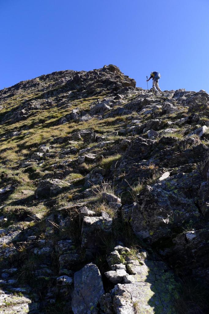 Descendemos ligeramente (NE) al collado entre los dos picos (2575m 2h33′) para comenzar la cresta del Garlitz. La primera parte no tiene complicación y hay una senda que faldea por la izquierda (oeste) y luego se sube a plena cresta a la antecima del Garlitz (2786m). Hasta ese momento no se ha visto la verdadera cima y ahora me impresiona un poco, pero vayamos paso a paso y ya veremos si las dificultades son superables o no.
