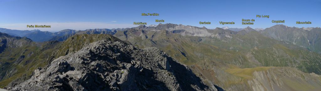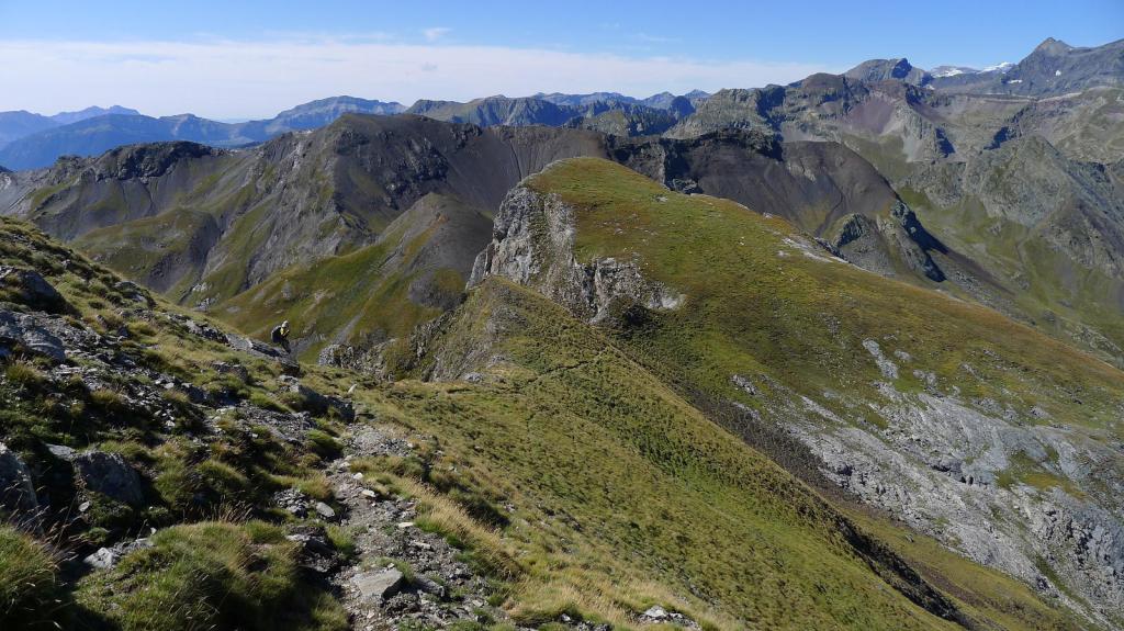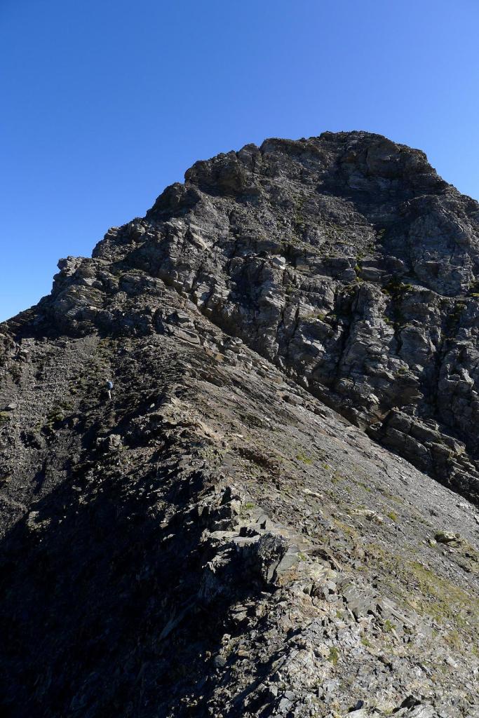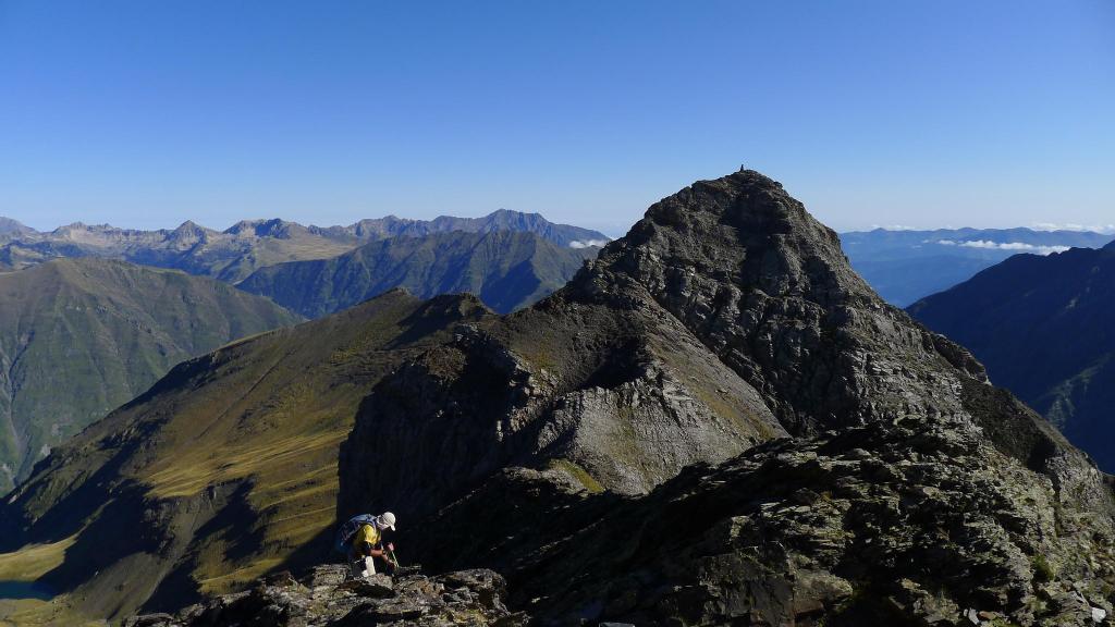 Tras un pequeño descenso comienza la auténtica cresta rocosa. Avanzamos siguiendo algún hito y buscando intuitivamente las zonas más sencillas. De momento es cuestión de prestar atención y casi siempre escorándonos ligeramente a la izquierda. Nos introducimos finalmente en la zona más vertical donde nos encontramos algunos pasos de IIº que nos llevan a unos últimos metros de cresta y a la cumbre del Garlitz (2798m 3h13′). Es una atalaya bien centrada para observar un precioso entorno de picos pirenaicos.