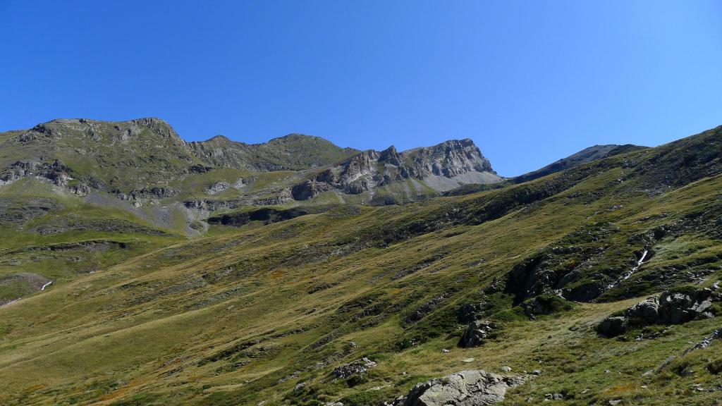 Llegamos a una bifurcación del sendero (2145m). A la derecha se va al puerto de Bielsa o de la Forqueta (ver la entrada) y a la izquierda daremos una curva para dirigirnos al NE, penetrando en el valle del río Nère. Tenemos que dirigirnos hacia una hondonada por donde se penetra en un valle superior colgado donde se forma el circo entre el Garlitz y el Pène Abeillère. Avanzamos por praderas con riachuelos y algo encharcadas. Pero al llegar a la zona alta del valle, en vez de penetrar en el valle superior, nos vamos a la derecha por una sendita que pasa bajo las paredes del Pène Abeillère, pensando que habrá algún otro paso para acceder a las laderas de este pico. Sin embargo avanzamos bajo una pared infranqueable hasta la proa sur del pico sin ver ninguna posibilidad de acceso. Esta equivocación nos cuesta 1.5km de distancia y 180m de desnivel extras.