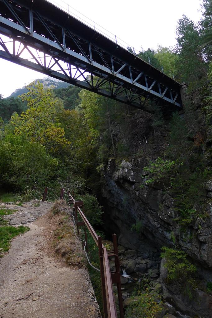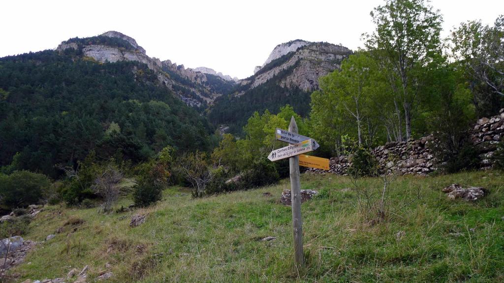 Partimos del puente de los Peregrinos (1050m), nada más pasar Canfranc pueblo. Subiremos por el camino de la Solana y bajaremos por el de la Besera. Desde el pequeño prado de aparcamiento salen varias pistas. No hay que tomar la más cercana al río Aragón, sino una que se aleja un poco pero luego continúa hacia el N paralela al río (carteles indicadores), marcada con señales verde y amarilla. Se atraviesa por un puente el barranco de Ip (1125m 0h10′), tomando el sendero dirección E por la orilla derecha y pasando enseguida bajo la vía del canfranero.
