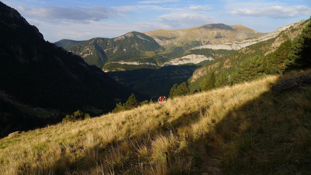 Avanzamos por bosque de pinos con avellanos y bojes, ascendiendo suavemente primero y luego en fuerte subida para situarnos bastante por encime del cauce del río que forma un profundo cañón. La vegetación se abre, atravesamos un gran barranco (1820m 1h33′) que cae vertical hacia el cauce del barranco de Ip. Poco después hay un refugio (1850m 1h40′) y llegamos a la zona de praderas que nos encamina al embalse de Ip. Se pasa junto a una casa refugio encalada de blanco de las obras del embalse (2060m 2h20′).