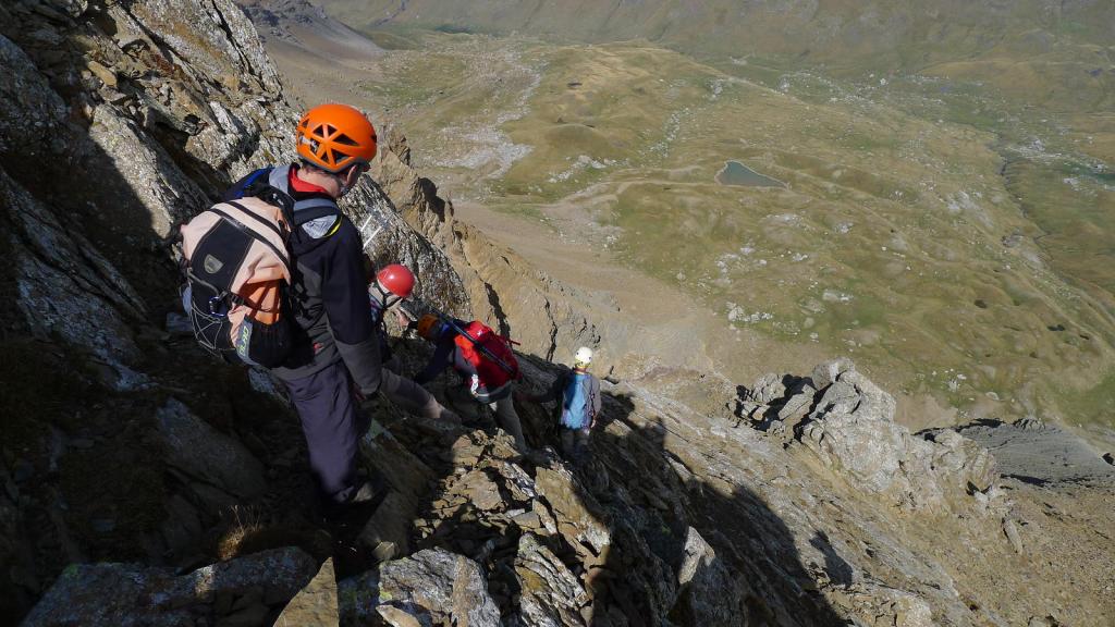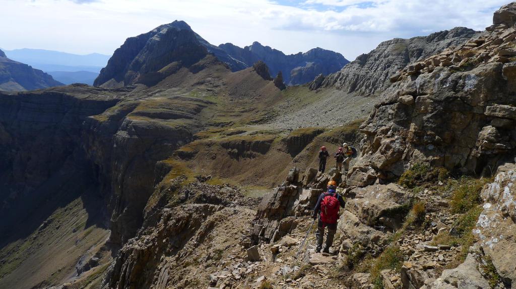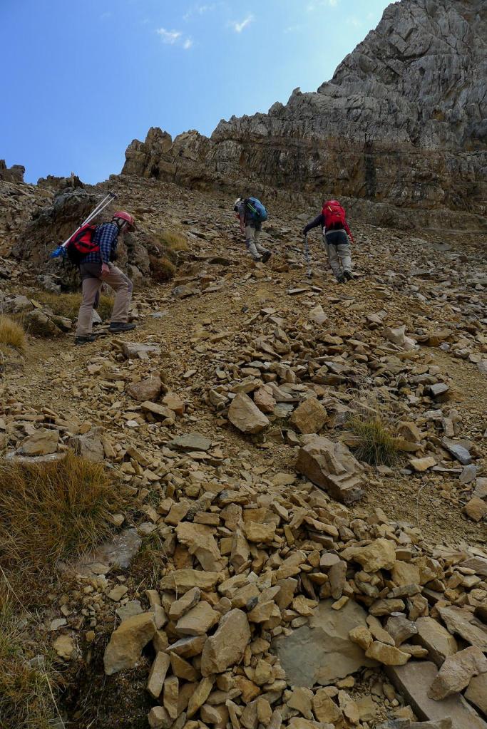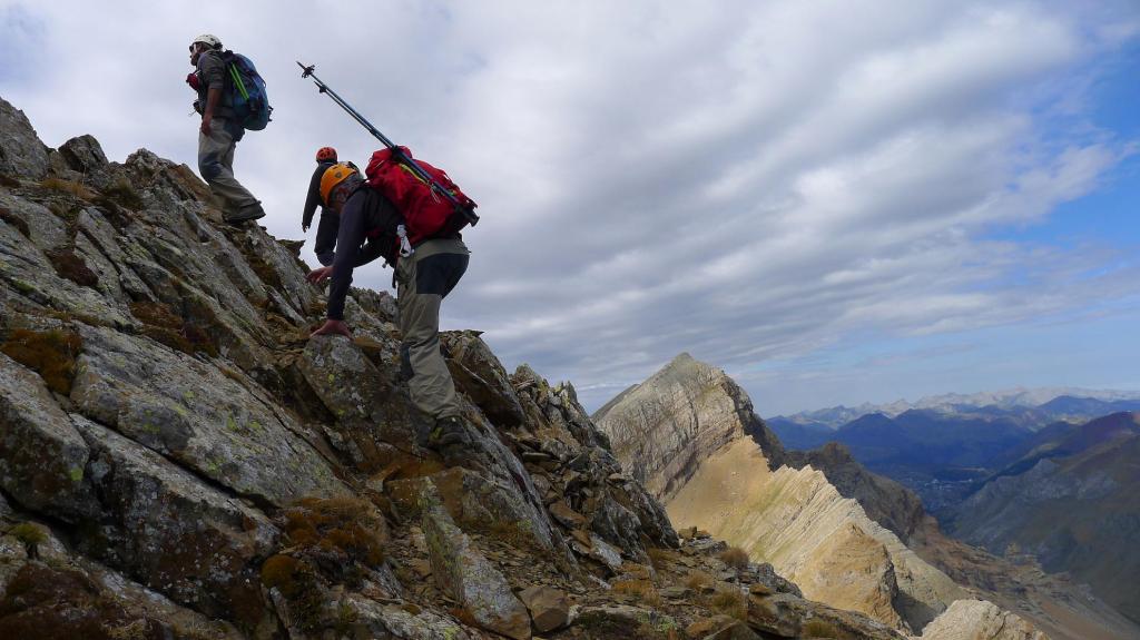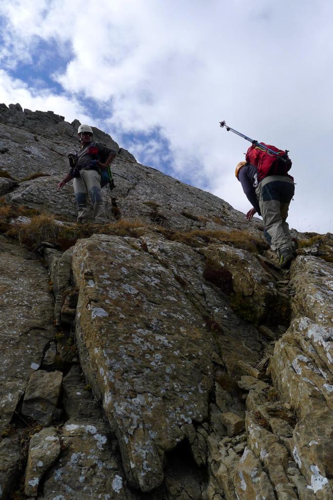 Nos ponemos el casco y ascendemos una primera parte todavía con sendero en la cara NW de Punta Escarra. El sendero termina en una barrera rocosa que escalamos para ir rodeando el pico hasta situarnos en su cara N. Ahora hay que afrontar esa cara, muy pendiente, pero que ofrece viras y repisas que, prestando atención y usando las manos, nos van acercando a la cumbre. Hay muchos hitos. Por fin, y antes de lo que uno piensa puesto que el ascenso es muy entretenido, nos encaramamos a la cima de Punta Escarra (2751m 4h45′), con unas vistas espectaculares que ya se van disfrutando durante toda la escalada.