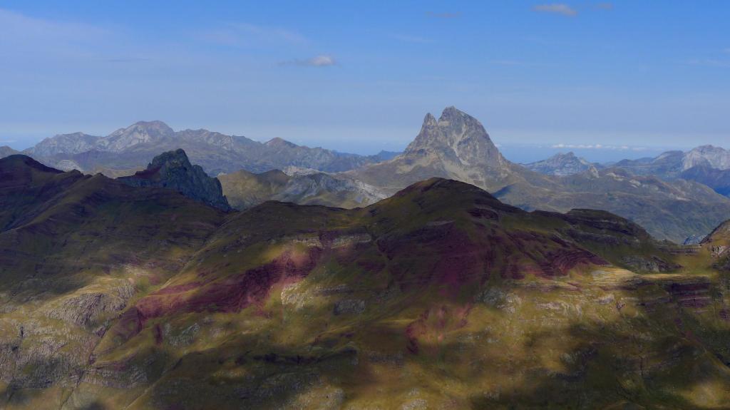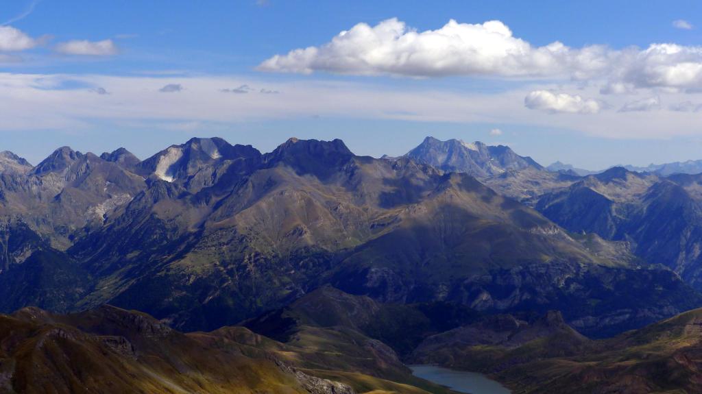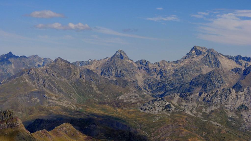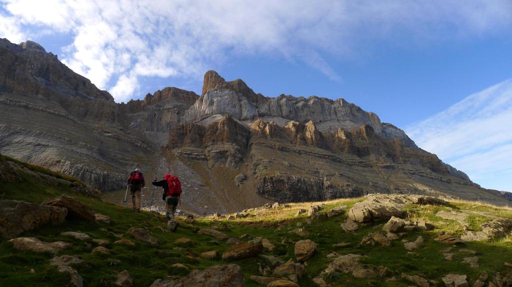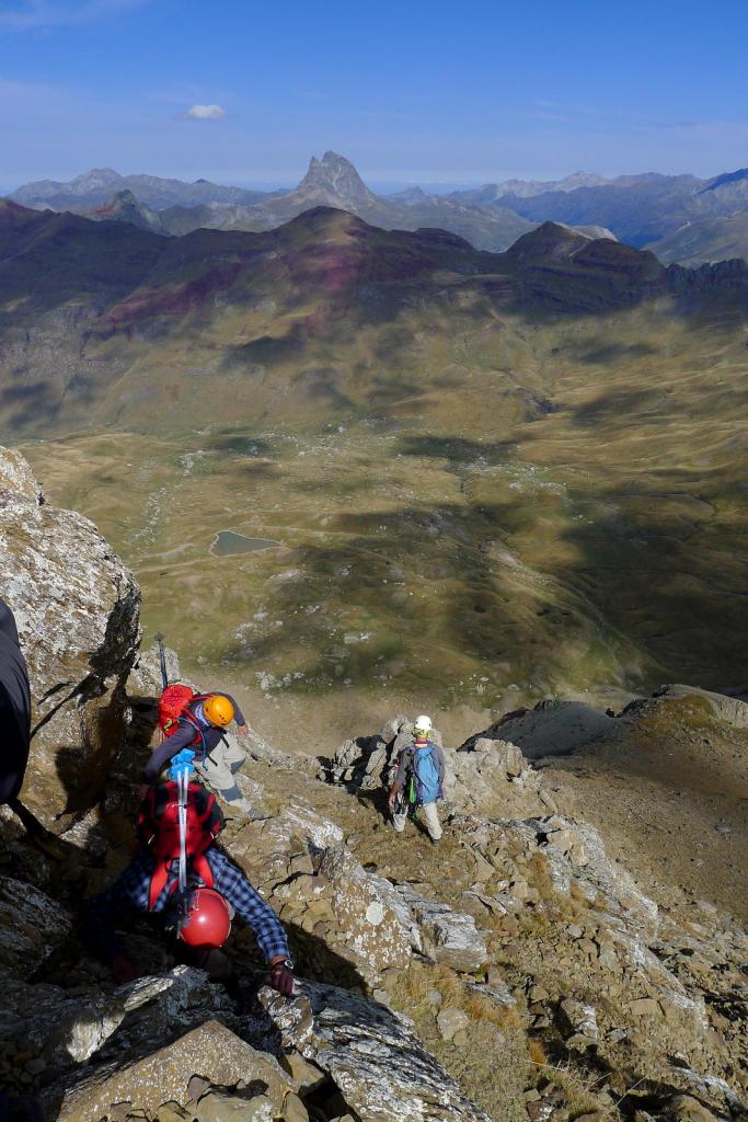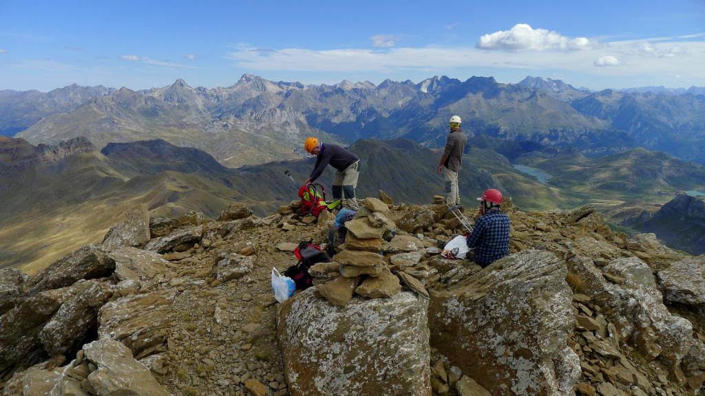 Nos ponemos el casco y ascendemos una primera parte todavía con sendero en la cara NW de Punta Escarra. El sendero termina en una barrera rocosa que escalamos para ir rodeando el pico hasta situarnos en su cara N. Ahora hay que afrontar esa cara, muy pendiente, pero que ofrece viras y repisas que, prestando atención y usando las manos, nos van acercando a la cumbre. Hay muchos hitos. Por fin, y antes de lo que uno piensa puesto que el ascenso es muy entretenido, nos encaramamos a la cima de Punta Escarra (2751m 4h45′), con unas vistas espectaculares que ya se van disfrutando durante toda la escalada.