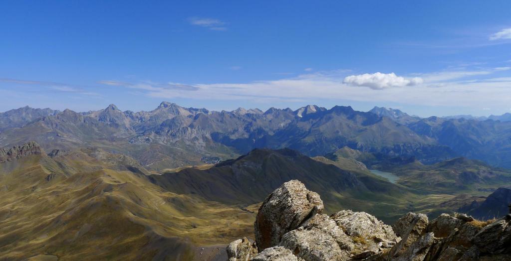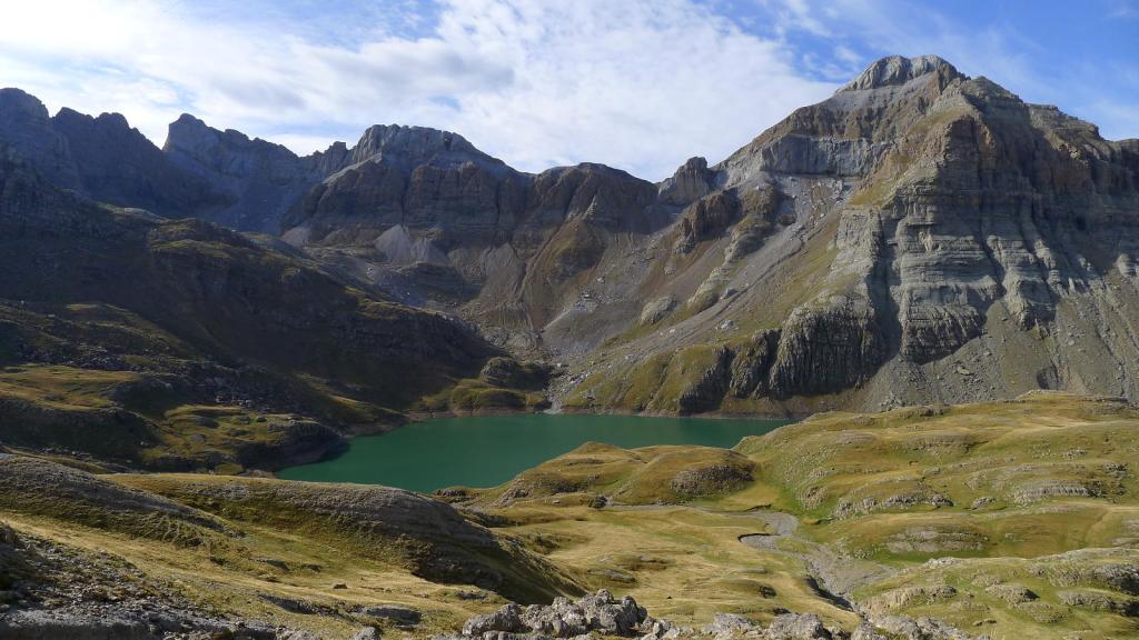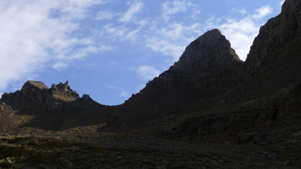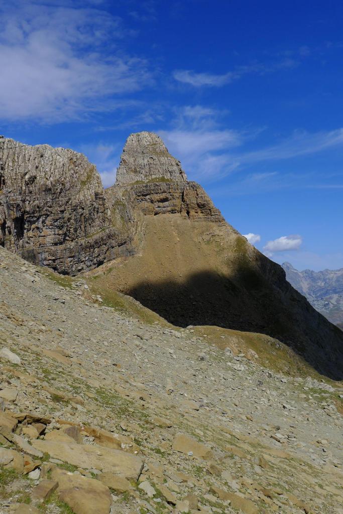 A partir de aquí nos separamos del embalse en dirección ENE, por vaguadas de pasto con la mirada puesta en el collado a la izquierda de la Punta Escarra y a la derecha de un gendarme de roca muy característico. Se cruza el barranco que desciende del collado oriental de la Pala de Ip (2275m 3h02′) y seguimos traza de senda e hitos (cuidado porque hay otras sendas que nos quieren llevar más a la izquierda y nuestra referencia debe ser el collado a la izquierda de la Escarra). El terreno se va haciendo más rocoso hasta llegar al collado NW de Punta Escarra (2580m 3h45′), y bajo el imponente gendarme.