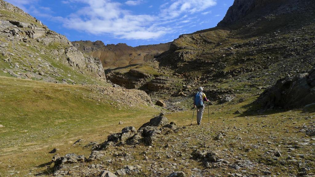 Descendemos por la misma ruta hasta aproximadamente 2710m. Entonces giramos a la derecha rodeando el pico por el E y hacia el S, por repisas que nos conducen hasta un pequeño hombro (2610m 5h45′) desde el que visualizamos el recorrido al collado entre el Hombro de Escarra y los Campanales de Ip. Descendemos hasta un circo colgado sobre el río Escarra a unos 2470m y ascendemos a dicho collado (2547m 6h20′).