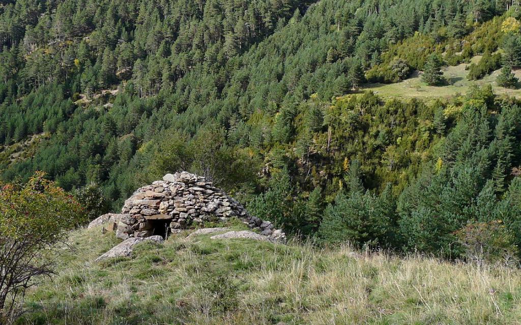 Un descenso bastante directo lleva a la presa de Ip (2120m 7h20′) donde tomamos el camino de la Besera por la orilla izquierda del barranco de Ip, señalizado con blanco y amarillo. Pasamos junto a un curioso refugio de pastores en forma de iglú (1470m 9h00′) y terminamos el descenso otra vez por pinar hasta el aparcamiento (1050m 9h50′)