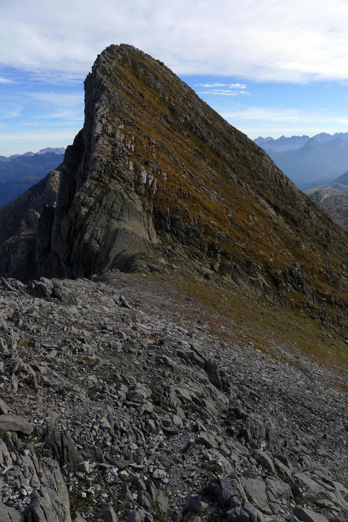 Desciendo con mucha atención al collado SW (2418m 2h32′) y asciendo la fácil cresta (siempre por el lado S) del Ruabe de Bernera (2455m 2h40′). Desde aquí el perfil del Olibón es espectacular.