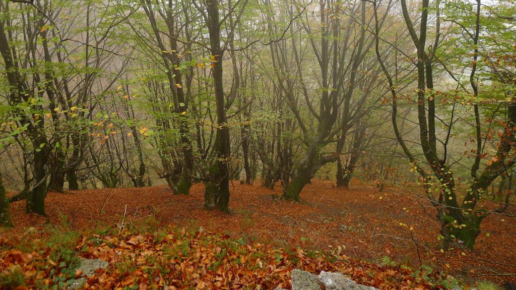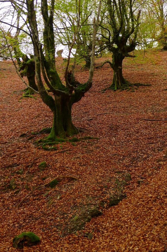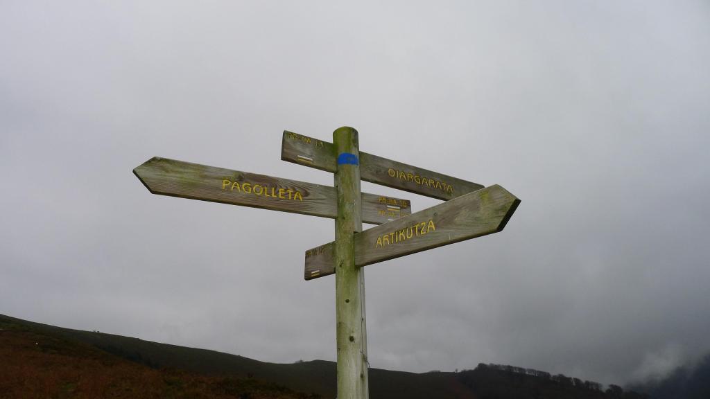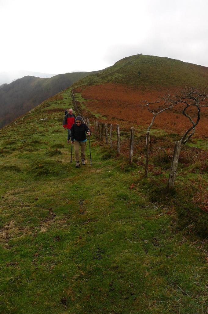 Seguimos la cresta en dirección NNW hasta un collado (657m 1h16′) donde termina la pista cementada y empieza una senda entre las hayas, que discurre por la ladera oeste y es una de las partes más bonitas del recorrido. Llegamos a unos carteles indicadores (768m 2h16′), donde nos desviamos al E por pastos abiertos para alcanzar la cima del Izu (829m 2h30′). Preciosa vista, aunque algo neblinosa, del valle y de las montañas hasta el Larrún (la Rhune).