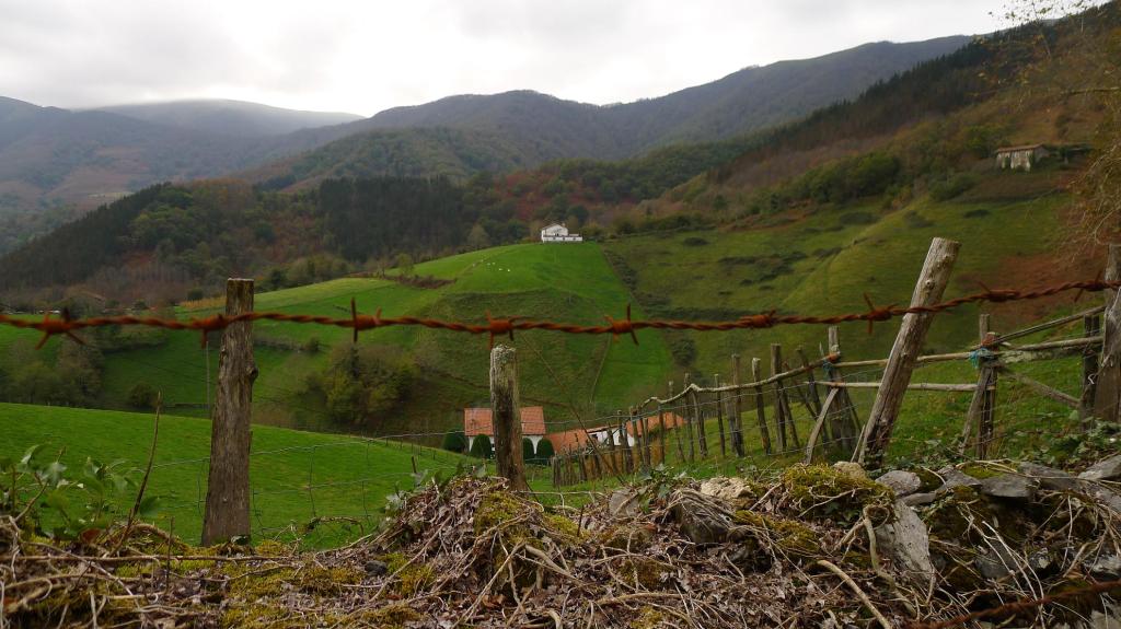 Continuamos a plena cresta por una sendita junto a la valla de alambre de espino (N) descendiendo al collado de Amekurrun (670m 3h32′), donde giramos casi 180º (SSE) por una pista, que irá girando hacia el E. Comemos junto a una cabaña de ganado (535m 3h58′) y continuamos por la pista hasta una explanada donde hay un abrevadero (484m 4h46′). Allí se bifurcan dos pistas, dudamos un momento, pero el camino a seguir es una senda, algo escondida al principio, entre las dos pistas, atajando entre ellas y bajando bastante directa hasta las bordas Goiko y Arizpe (276m 5h26′).