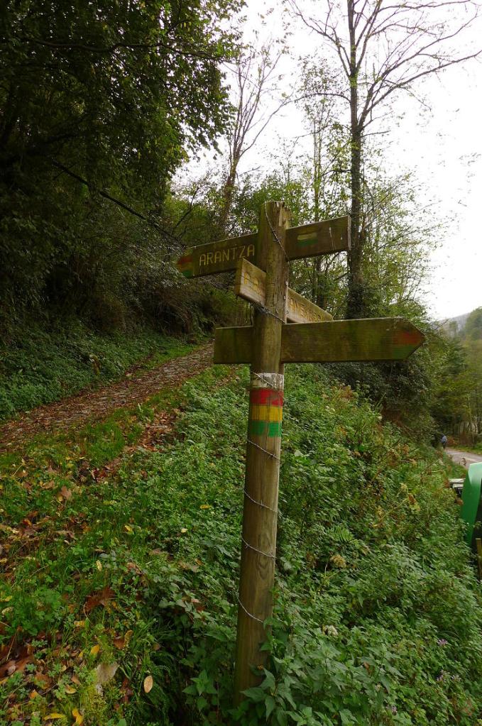 De nuevo en carretera asfaltada hasta la borda Larrañeneko, donde volvemos a tomar un camino que termina otra vez en carretera (143m 5h54′), avanzando junto a un arroyo que desemboca en el Latsako en el emplazamiento de la depuradora (140m 6h00′). Allí mismo, un cartel a la derecha nos indica la subida al pueblo. Es un camino empedrado con fuerte pendiente que se hace duro después de la caminata del día, pero con un último esfuerzo llegamos a Arantza (260m 6h17′), donde tenemos un coche que dejamos anoche para subir a Burdingurutz y bajar con otros coches a recoger a todos los compañeros.