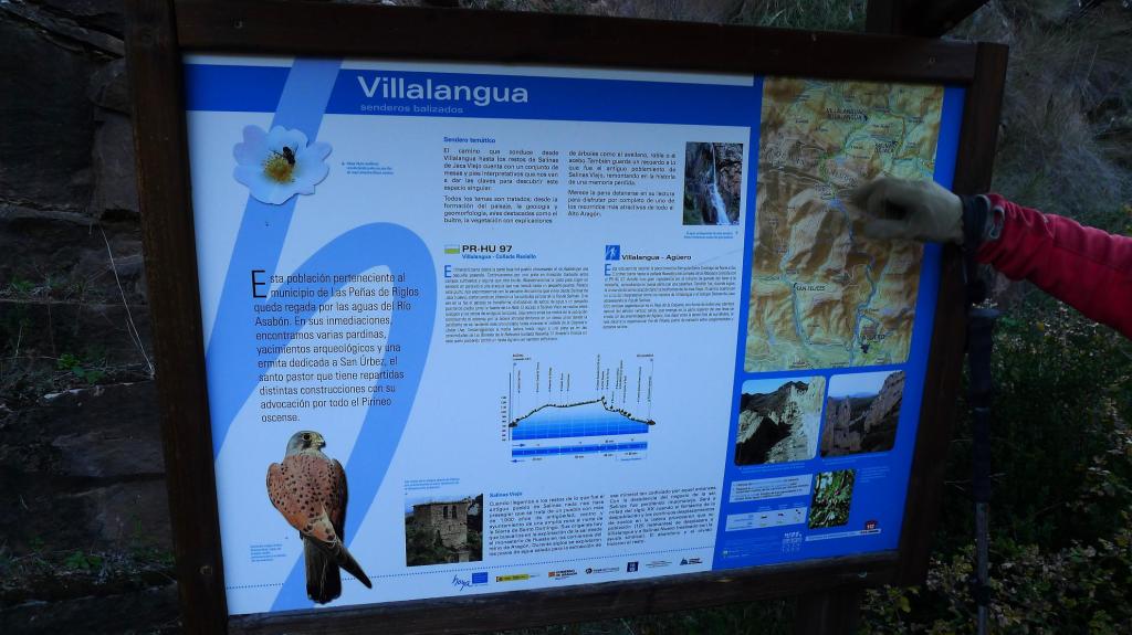 Un poco más arriba de la desembocadura del río Asabón en el Gállego, en el embalse de la Peña, se halla el pequeño pueblo de Villalangua, donde se inicia el PR-HU-97 que llega hasta Agüero. Lo seguiremos hasta el collado de la Osqueta, para hacer luego una ruta circular de vuelta a Villalangua. Recorrido de gran interés tanto geológico como por las vistas que depara, sobretodo la primera parte hasta la Osqueta.