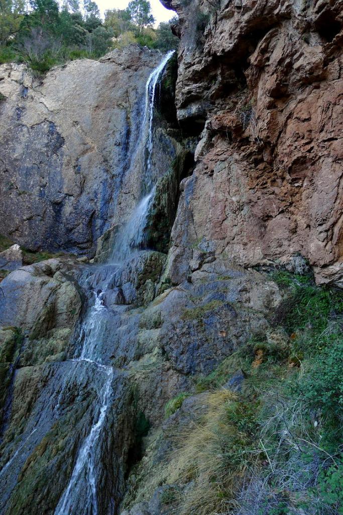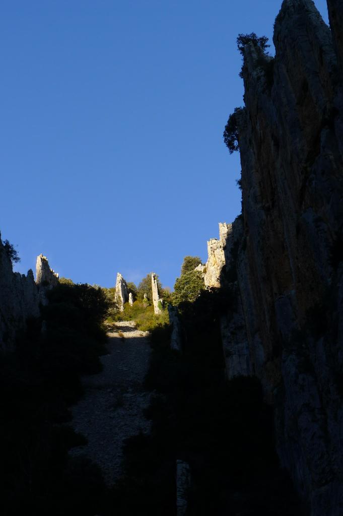 Al entrar en la foz hay una cascada (800m 0h40′) a la izquierda. el barranco se ha abierto paso entre una sucesión de estratos verticales de toba calcárea a modo de impresionantes murallas . La senda zigzaguea hasta llegar al pueblo de Salinas Viejo (910m 0h56′), con su iglesia en ruinas pero todavía en pie.