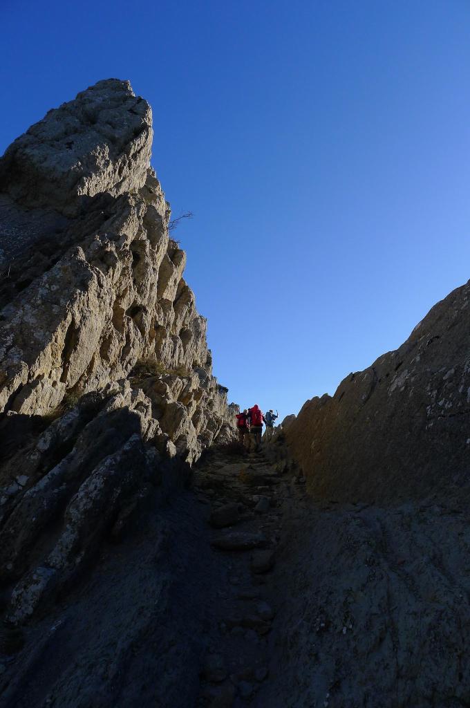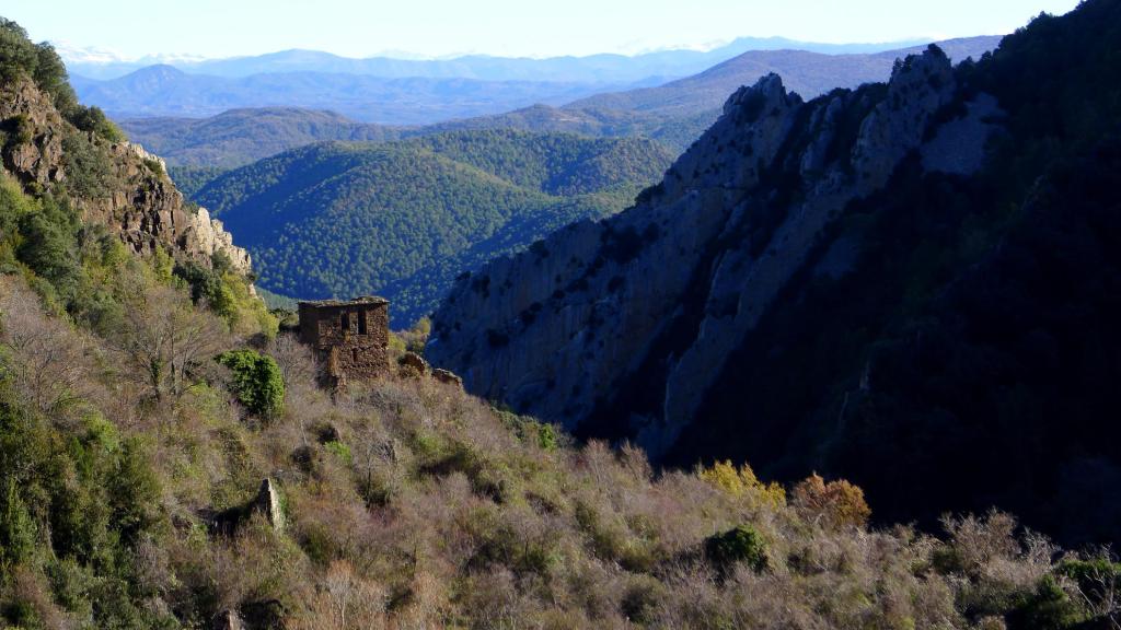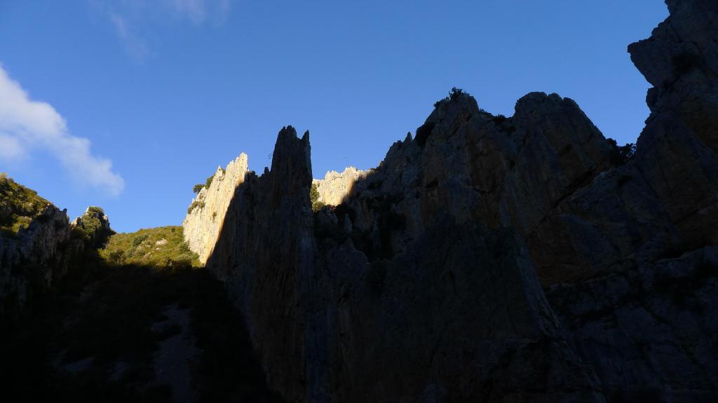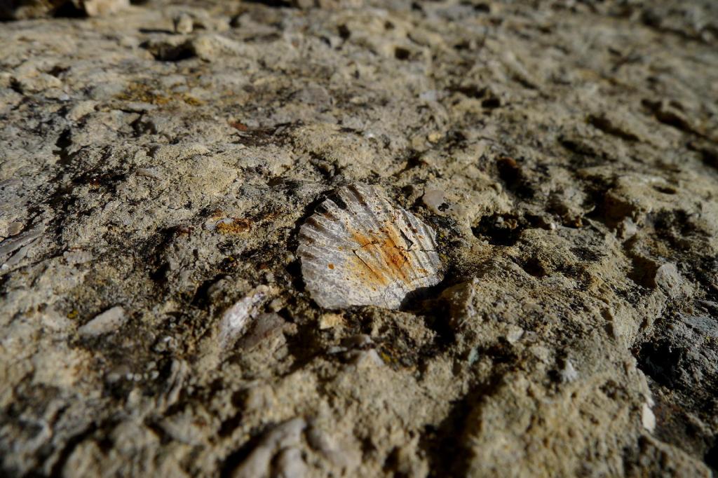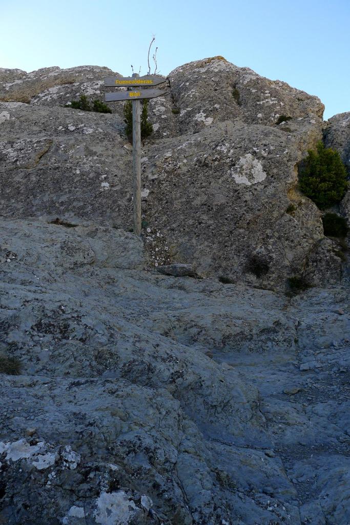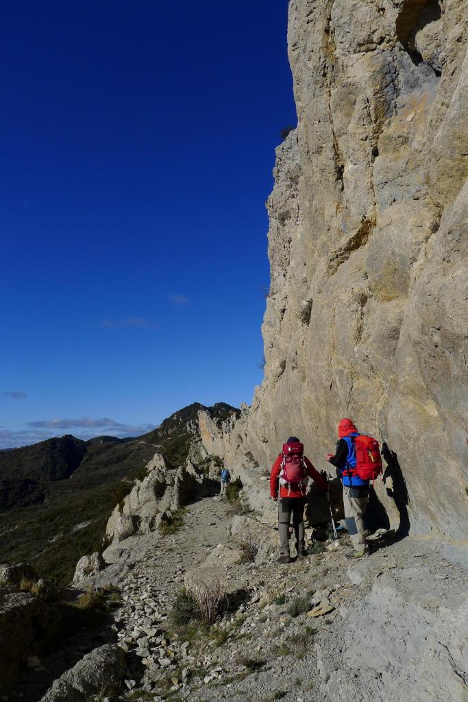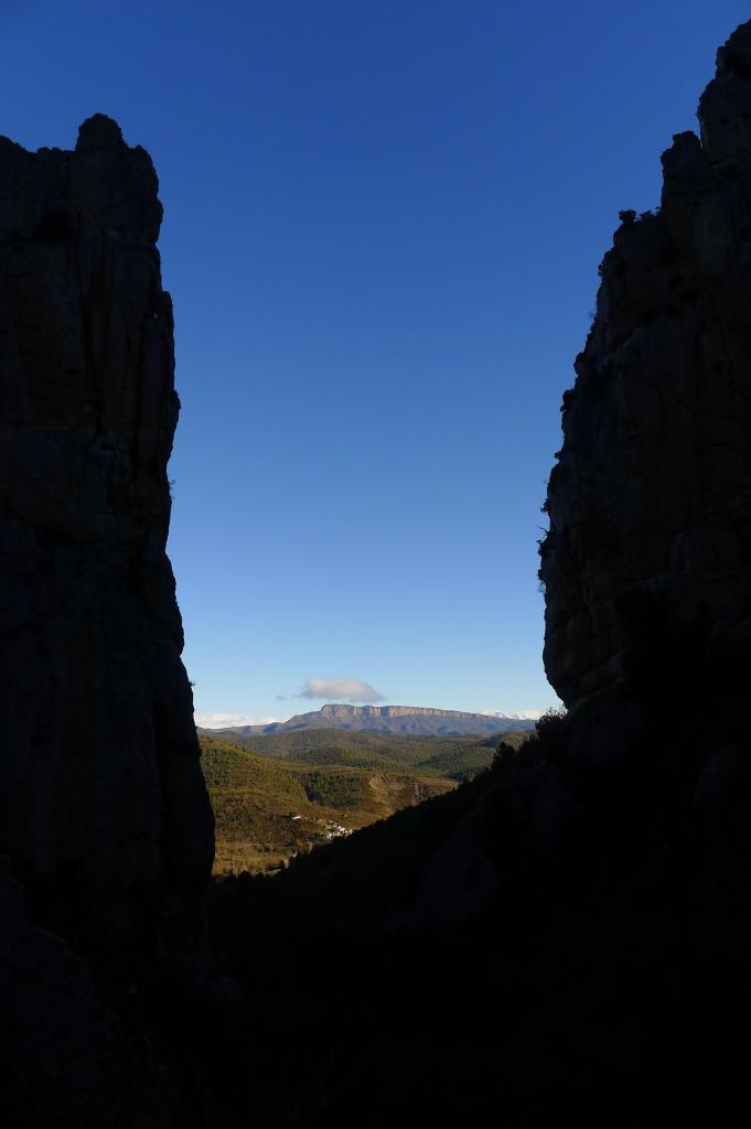 El valle se abre entonces y continúa elevándose entre bojes, pinos y quejigos hasta el collado de la Osqueta (1182m 1h40′), atravesando la gran muralla superior. Sus rocas tienen abundantes fósiles y el viento, que prácticamente nos tambalea, nos obliga a guarecernos en una zona al resguardo para comer un bocado.