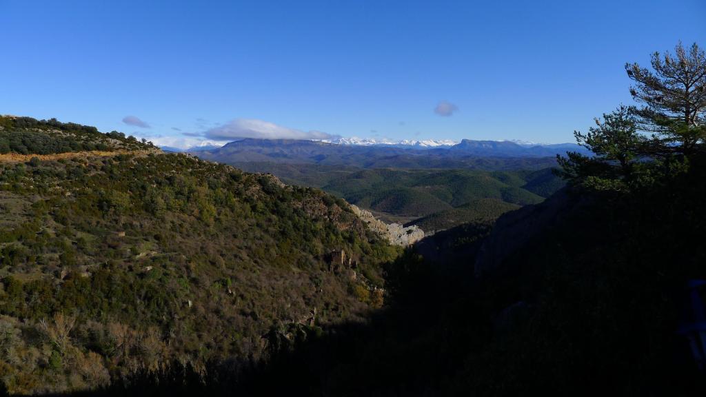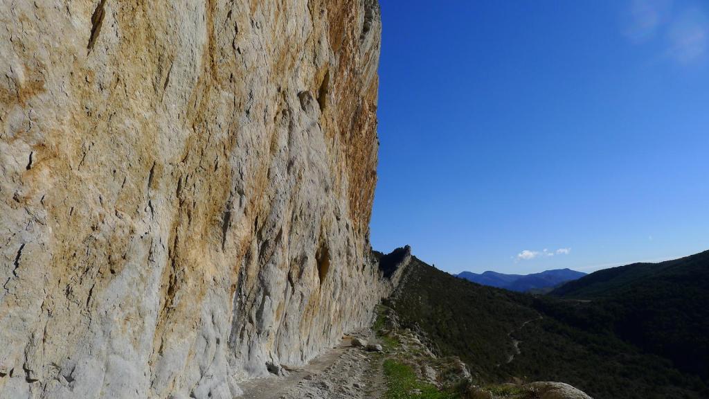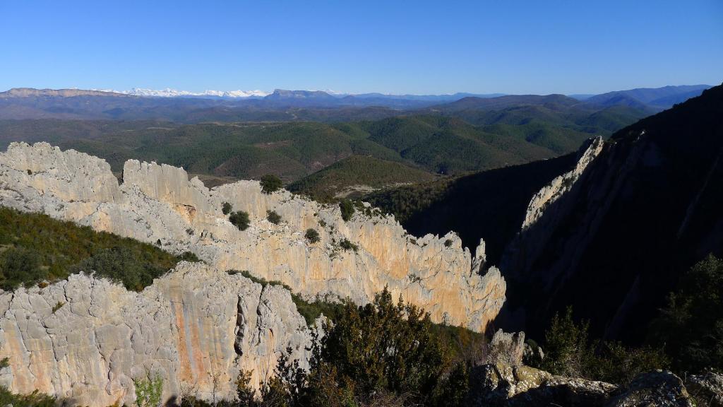 Seguimos junto a la muralla, por su cara S, hacia el oeste. Desaparecen las marcas blancas y amarillas del PR, pero aparecen unas ostentosas marcas de pintura amarilla. Conectamos con una pista (1250m 2h30′) que nos lleva a un paso (1282m 2h40′), al este del vértice del Fachar, por donde salimos de nuevo a la cara N. Magníficas vistas del Pirineo y de las sierras de San Juan de la Peña y Oroel. El descenso es ya por pista, entre un espléndido pinar. Encontramos una senda a la derecha que volvería a Salinas Viejo (1000m 3h45′), pero seguimos por la pista, desembocando a una pista principal (830m 4h15′). Aquí hay un par de coches aparcados.