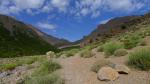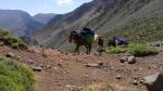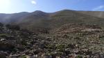 Seguimos por el fondo de un profundo barranco y, cuando el valle se abre, aparecen unos campos de cultivos y las casas de Azib Ikkis (2160m 1h53′). Enseguida nos desvíamos por un valle lateral a la derecha (SW) que sube con un poco más de pendiente hasta el primer collado (2880m 3h47′). A la mula ya le ha costado un poco subir hasta aquí.