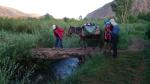Al llegar a la zona baja, el sendero es como un riachuelo, y en la vaguada delante del refugio el río baja crecido, pero no nos entretenemos en buscar un paso, nos lanzamos directos aunque el agua nos cubre hasta las rodillas, de todos modos estamos empapados.