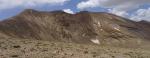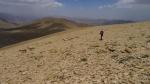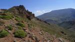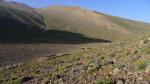 Nos vamos a la derecha, descendiendo a otra vaguada seca donde hay numerosas edificaciones de piedra y paja para resguardo del ganado (brañas 2560m 1h25′). Hay una enorme ladera frente a nosotros que superamos faldeando por la izquierda, sin sendas, entre pedregales y erizones. Tenemos que cruzar dos barrancos, el primero (2750m 1h50′) bastante profundo nos obliga a descender un poco, el segundo (2980m 2h15′) más fácilmente.