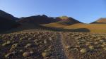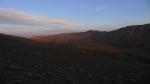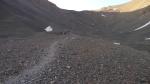 Nos levantamos alas 3.45 y salimos los últimos del refugio(2950m) a las 4.45, cuando ya empieza a haber un poco de luz y los frontales casi no se necesitan. Hay que atravesar una zona encharcada justo debajo del refugio y tenemos que dar alguna vuelta para buscar el mejor modo de vadearla. Luego ya se ve una senda clara que va avanzando con poca pendiente entre piedrillas y erizones.