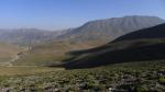 Cuando vuelven de la ascensión continuamos por la carretera sin asfaltar, subimos un puerto desde el cual el paisaje es espectacular, con enormes precipicios y pueblitos enclavados en las laderas, en lugares aparentemente inaccesibles, aprovechando la presencia de agua. Cogemos a un paisano haciendo dedo que debe llevar horas andando. Lo dejamos donde sale otra pista y continúa andando.