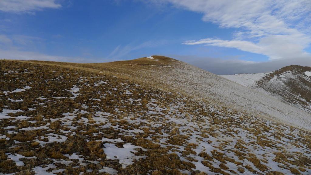 Ya estoy al pie de la ladera de la Punta de las Blancas, así que básicamente me dirijo hacia arriba para buscar lo más directo posible la cima. Es terreno de hierba y piedrecillas, semicubierto de nieve, con un poco de esfuerzo pero sin problemas llego a la cresta alomada (2045m 2h20′) y a la cumbre (Punta de las Blancas 2131m 2h30′).