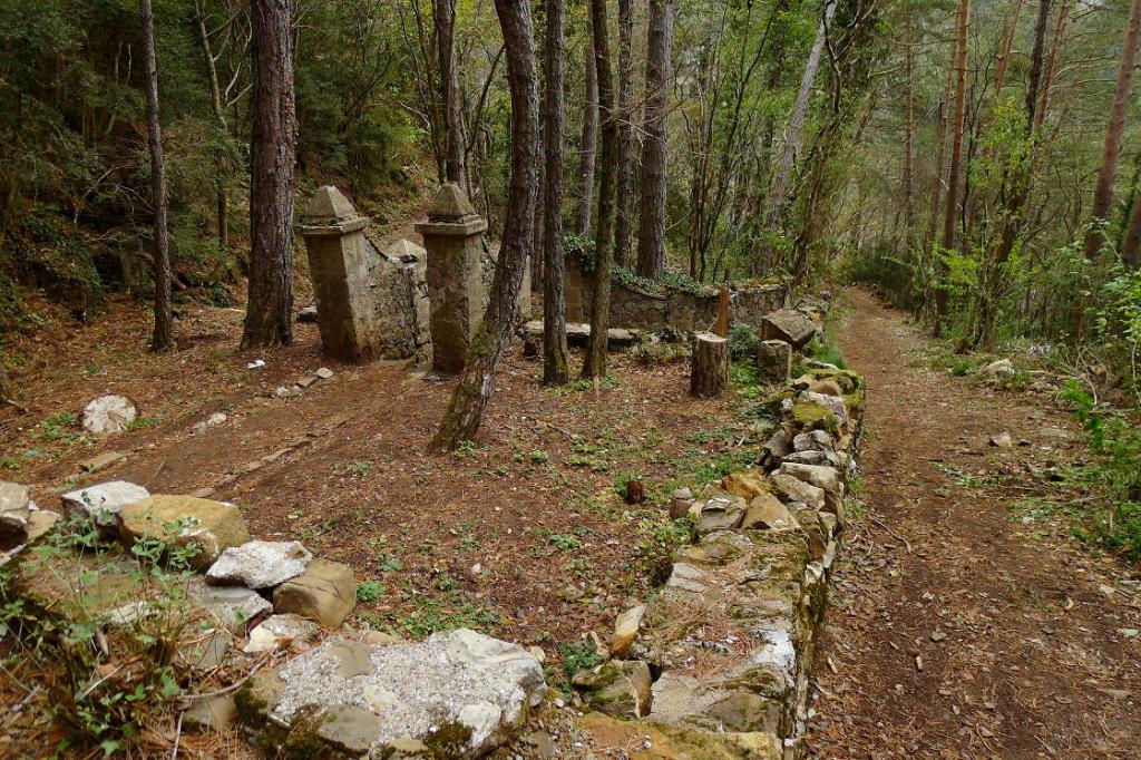 La primera parte es una curiosa zona con ruinas de edificios que pertenecieron a unos viveros y que hoy están invadidos por la vegetación como una especie de ciudad perdida. Se denomina bosque de los Enanitos. Se atraviesa el barranco de Arones sobre un azud (1140m). La senda zigzaguea entrando en un cerrado cañón donde la señal del GPS se pierde un poco. Hay una desviación a Villanúa (1270m) que dejo a mi izquierda. Salgo a la pista de Gabardito (1300m).