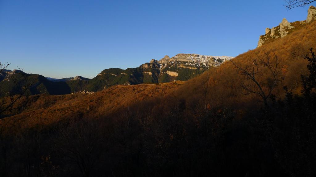 Estamos bajo la pared S de Castillo Mayor, nos dirigimos hacia el oeste y la pendiente se suaviza. Atravesamos un prado sin arbolado (1544m 0h46′) y la senda continúa claramente hacia la apertura del embudo que da acceso a la montaña. La vegetación se aclara, con matorral de erizones y bojes y por fin llegamos a la entrada de la vaguada central de Castillo Mayor (1755m 1h17′)